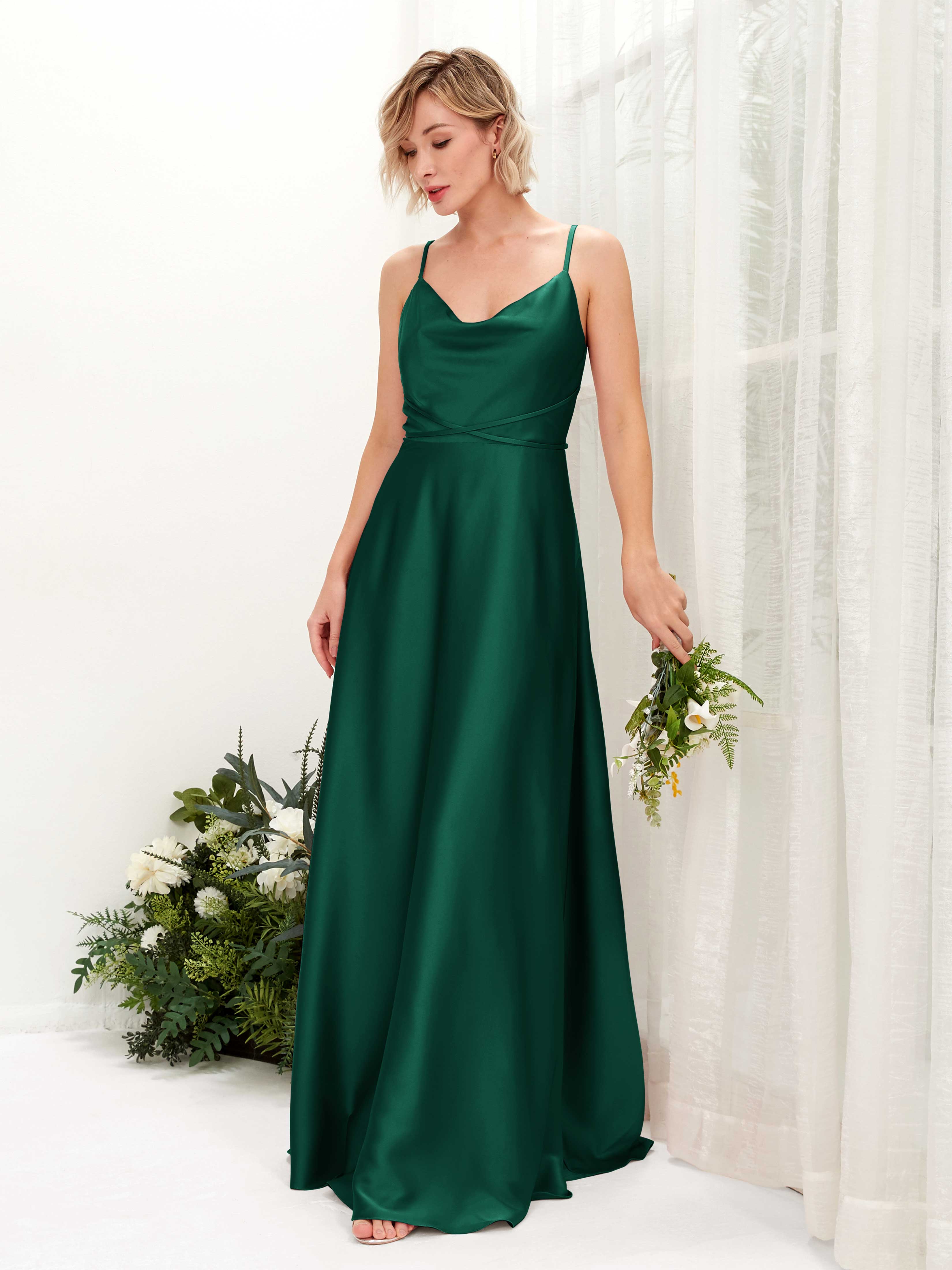 Carlyna Wallis A-Line Hunter Green Satin Bridesmaid Dress Maxi Sleeveless Cowl Neck Dress Front View