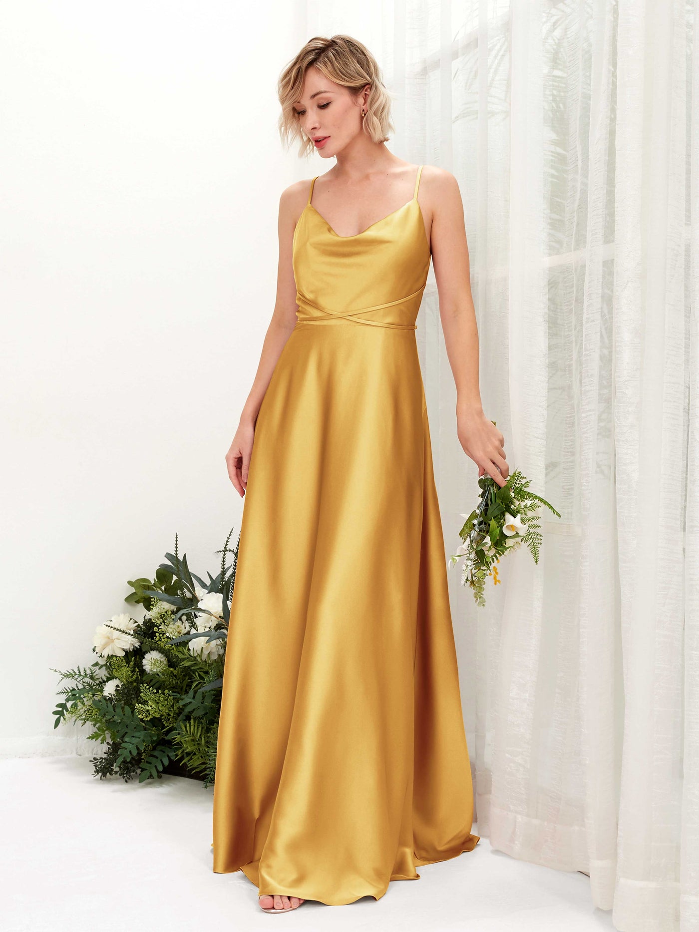 Carlyna Wallis A-Line Canary Satin Bridesmaid Dress Maxi Sleeveless Cowl Neck Dress Front View