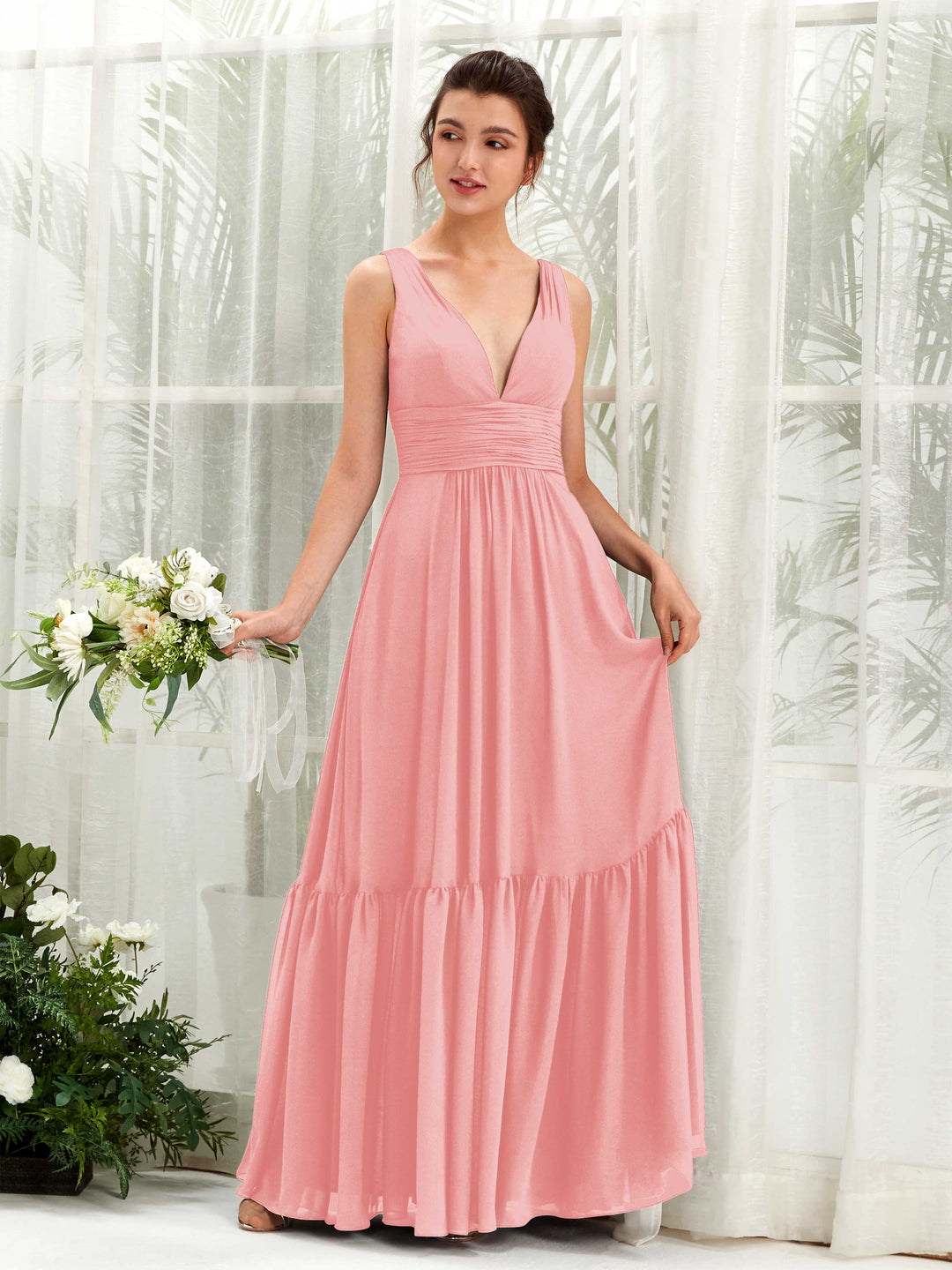 Carlyna Alissa A-Line Coral Pink Bridesmaid Dress Maxi Sleeveless V-Neck Dress Front View