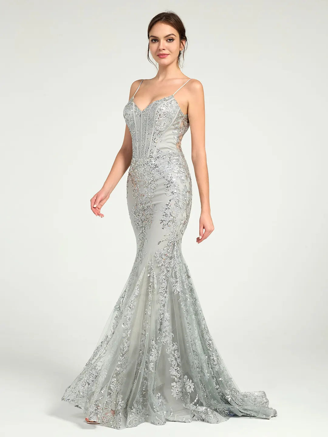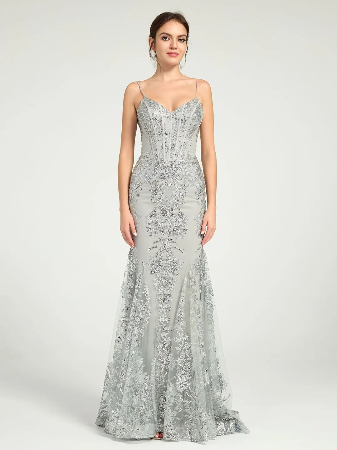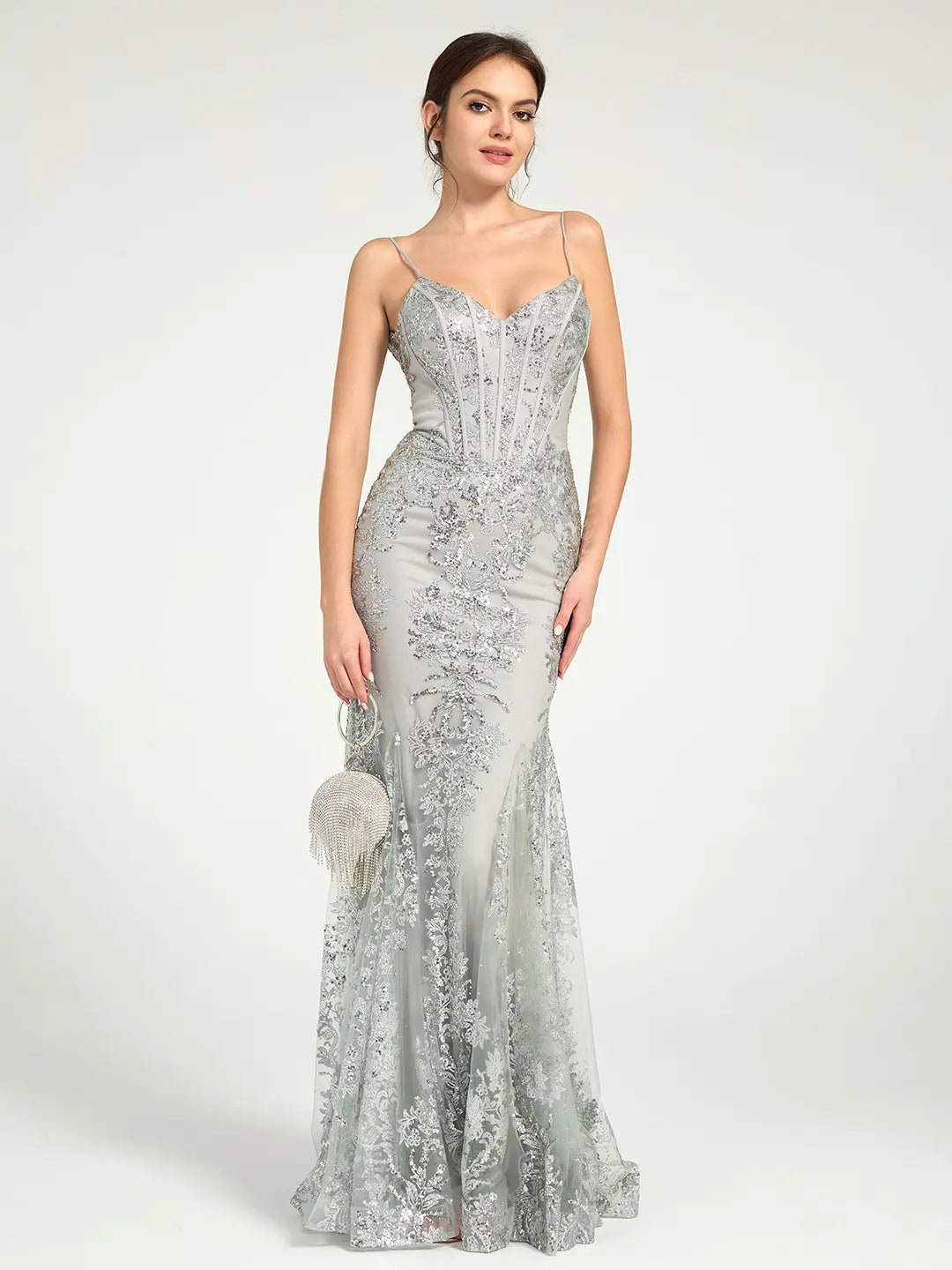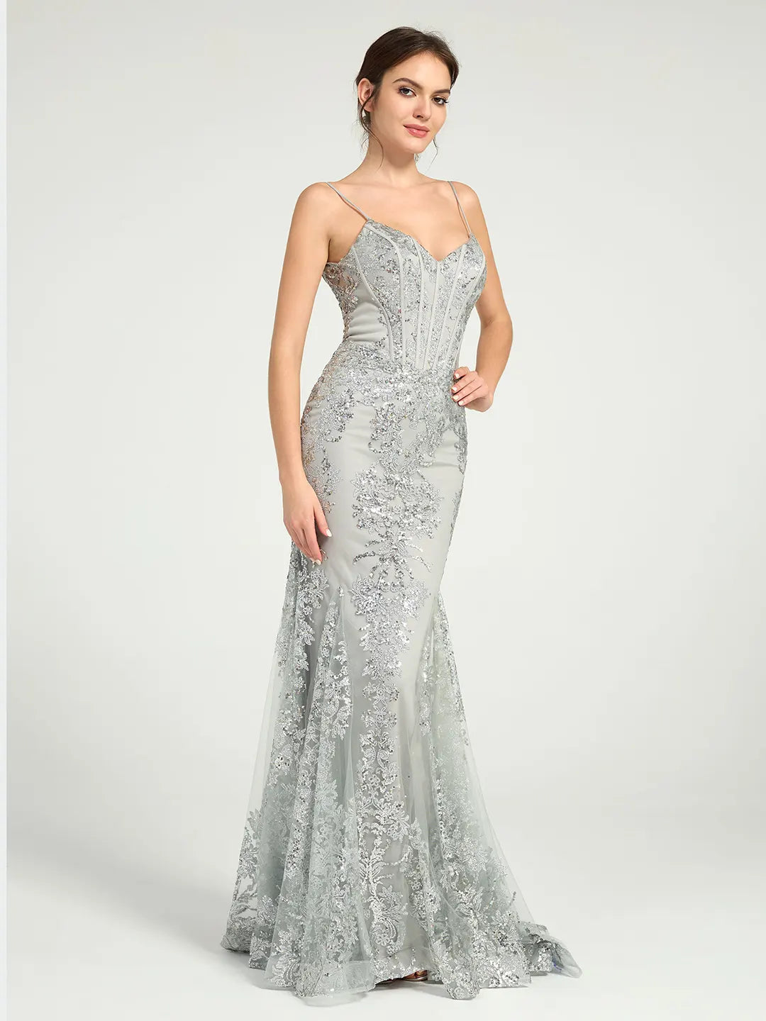 Dazzle and delight in this Silver Long Fit & Flare Corset Prom Dress, designed to make you feel like a queen at any special event. This gown showcases a stunning sweetheart neckline and a fitted corset bodice with intricate boning that beautifully enhances your curves. The glittering floral embellishments add a touch of luxury to the shimmering silver fabric, while the mermaid silhouette creates a graceful, flattering shape that flares elegantly as you move.