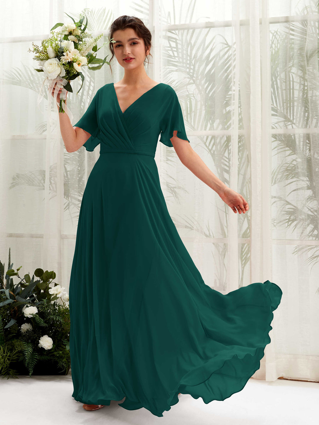 Dark Emerald Chiffon A-Line V-Neck Maxi Dress