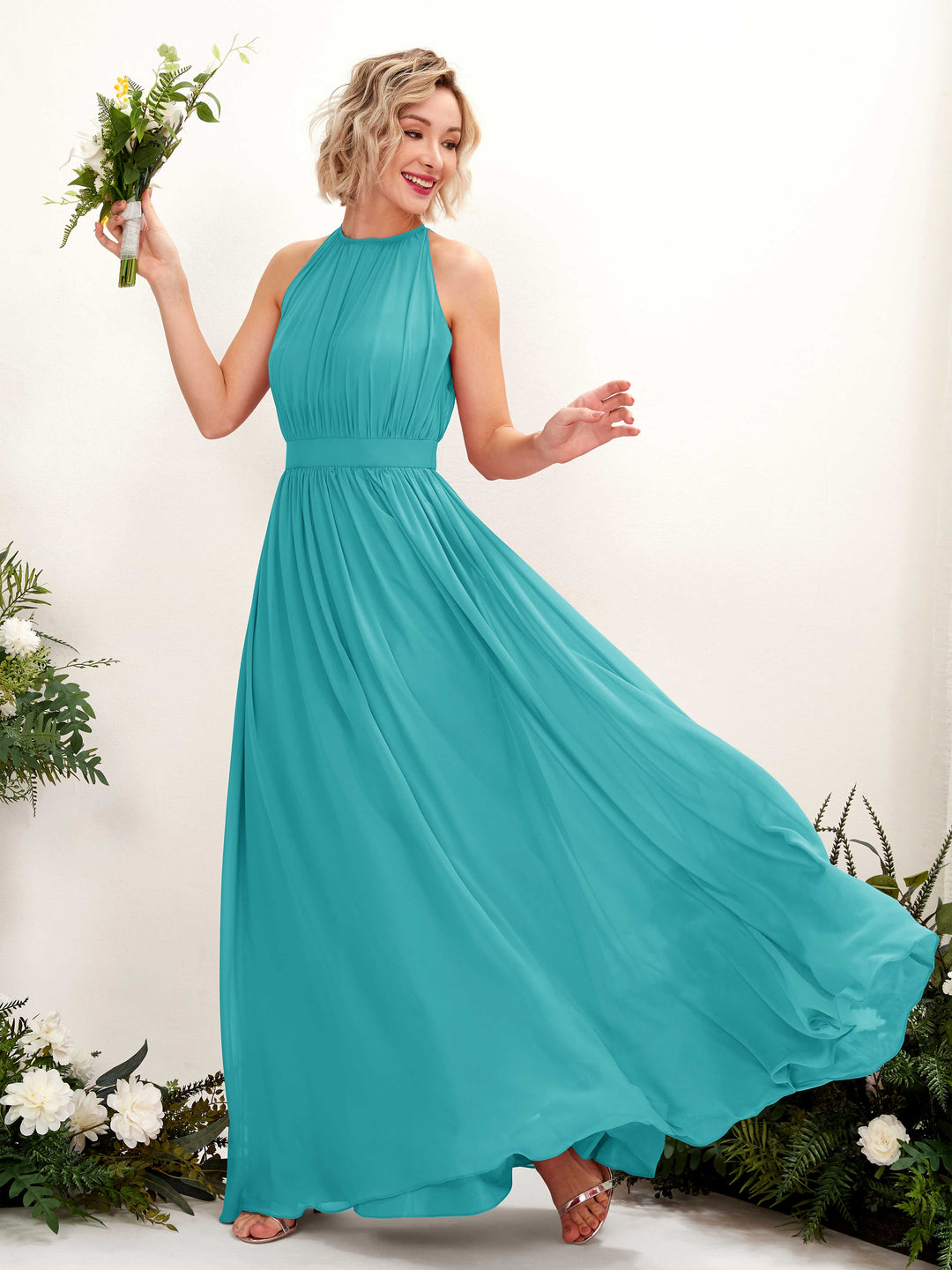 Turquoise Chiffon A-Line Round Neck Maxi Dress