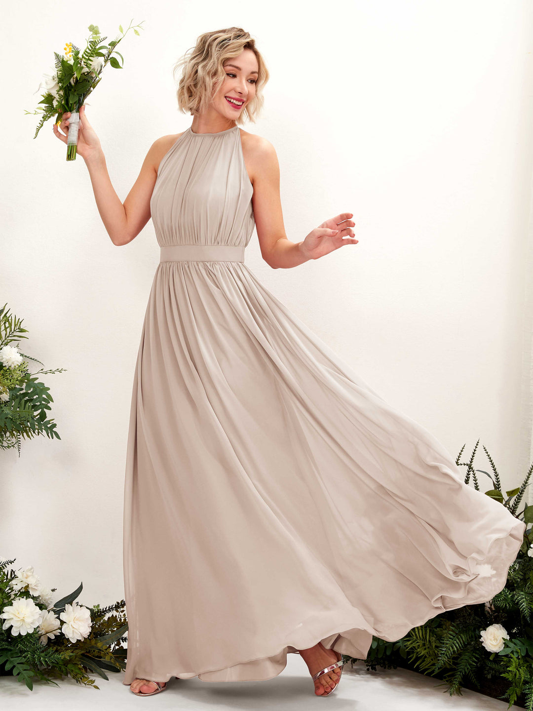 Carlyna Eden A-Line Biscotti Bridesmaid Dress Maxi Sleeveless Round Neck Dress Front View