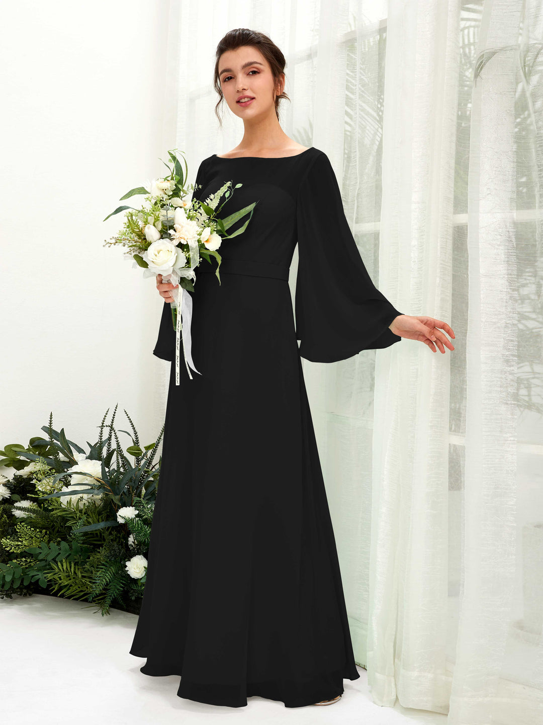 Black Chiffon A-Line Boat Neck Long Sleeve Maxi Dress