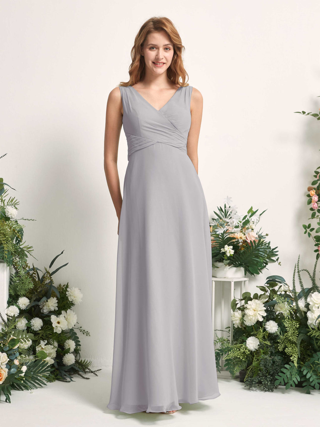 Carlyna June A-Line Silver Bridesmaid Dress Maxi Sleeveless V-Neck Dress Front View