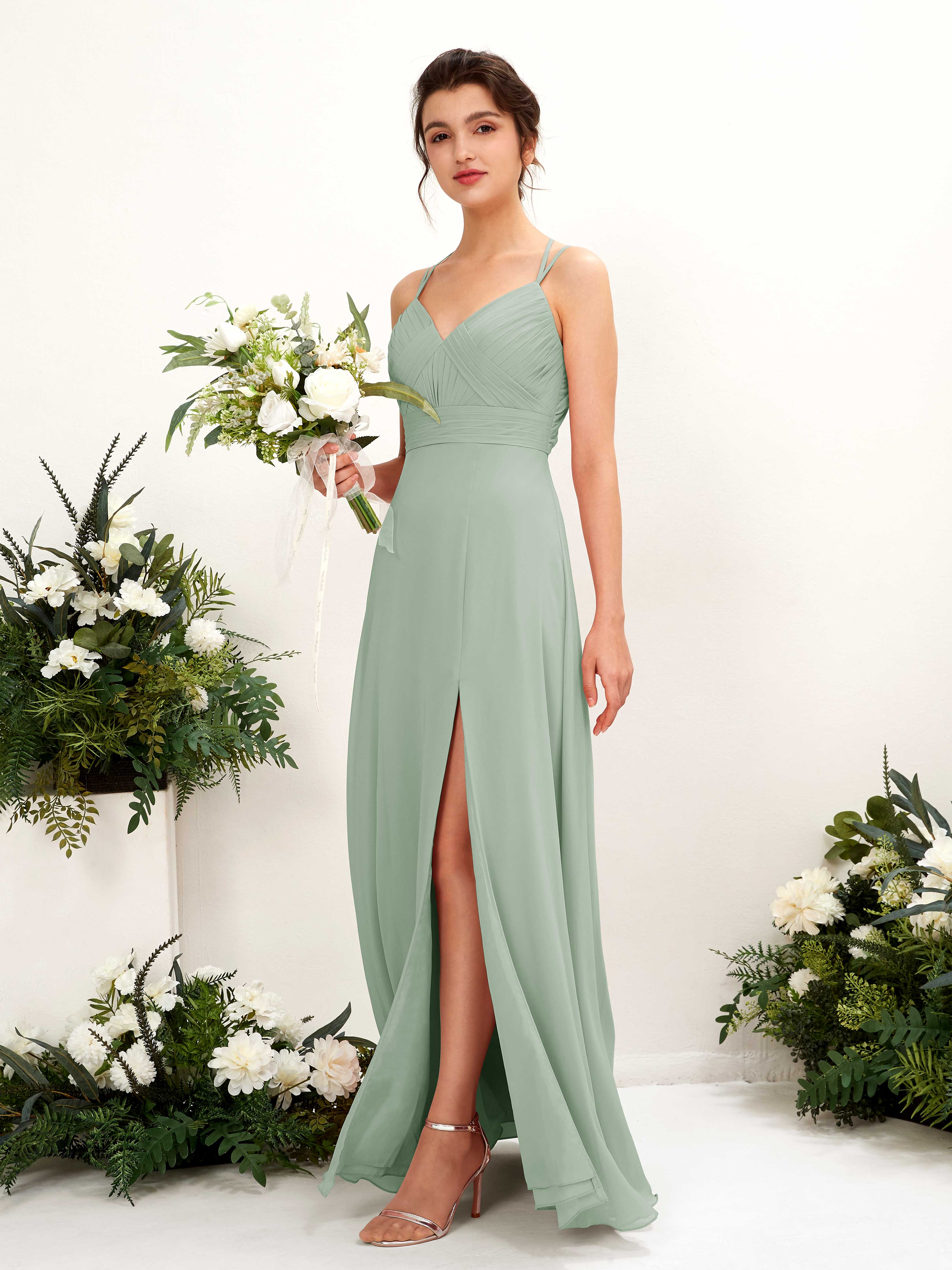 Carlyna Joa A-Line Sage Green Bridesmaid Dress Maxi Sleeveless V-Neck Dress Front View