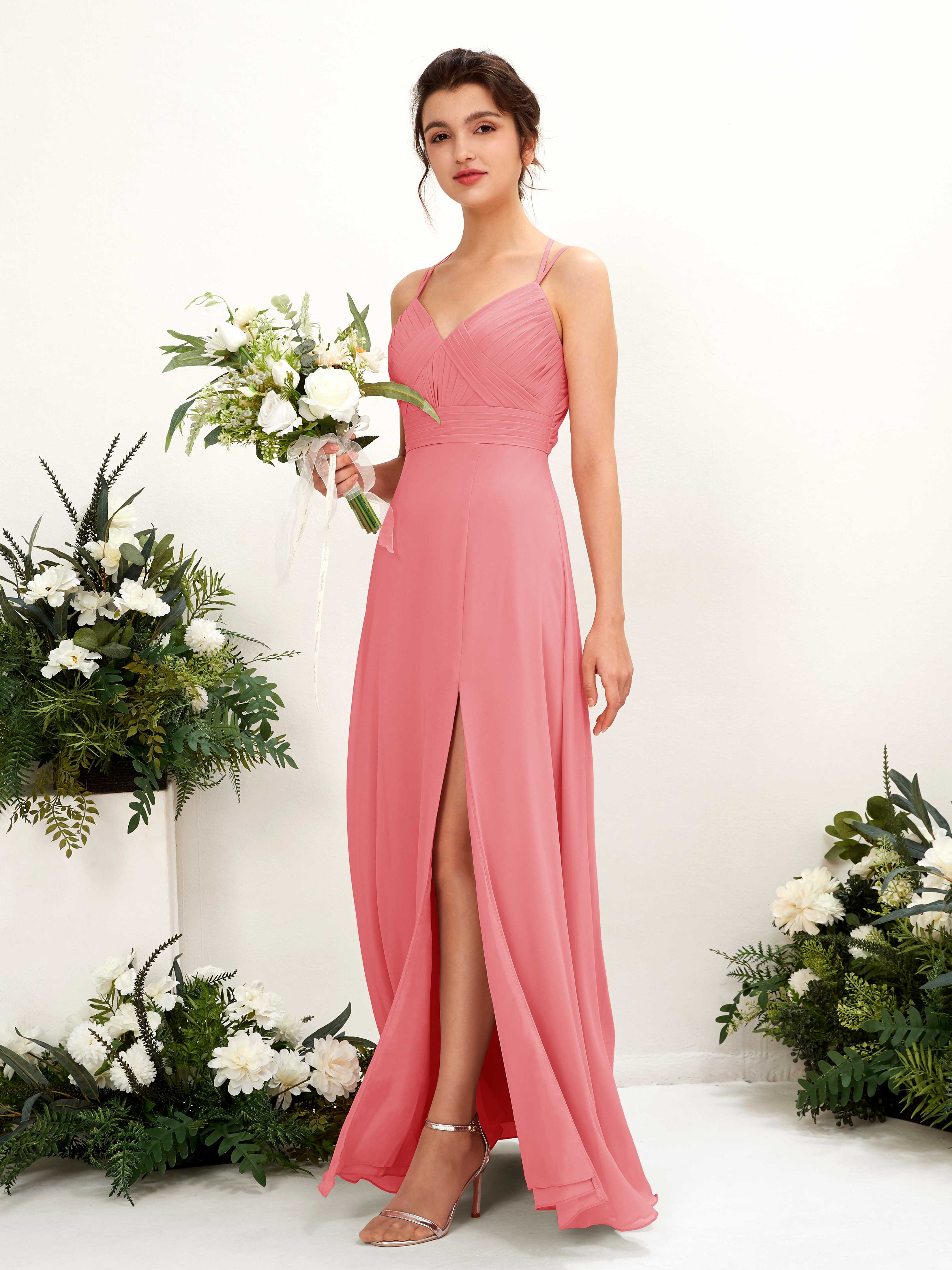 Carlyna Joa A-Line Coral Pink Bridesmaid Dress Maxi Sleeveless V-Neck Dress Front View