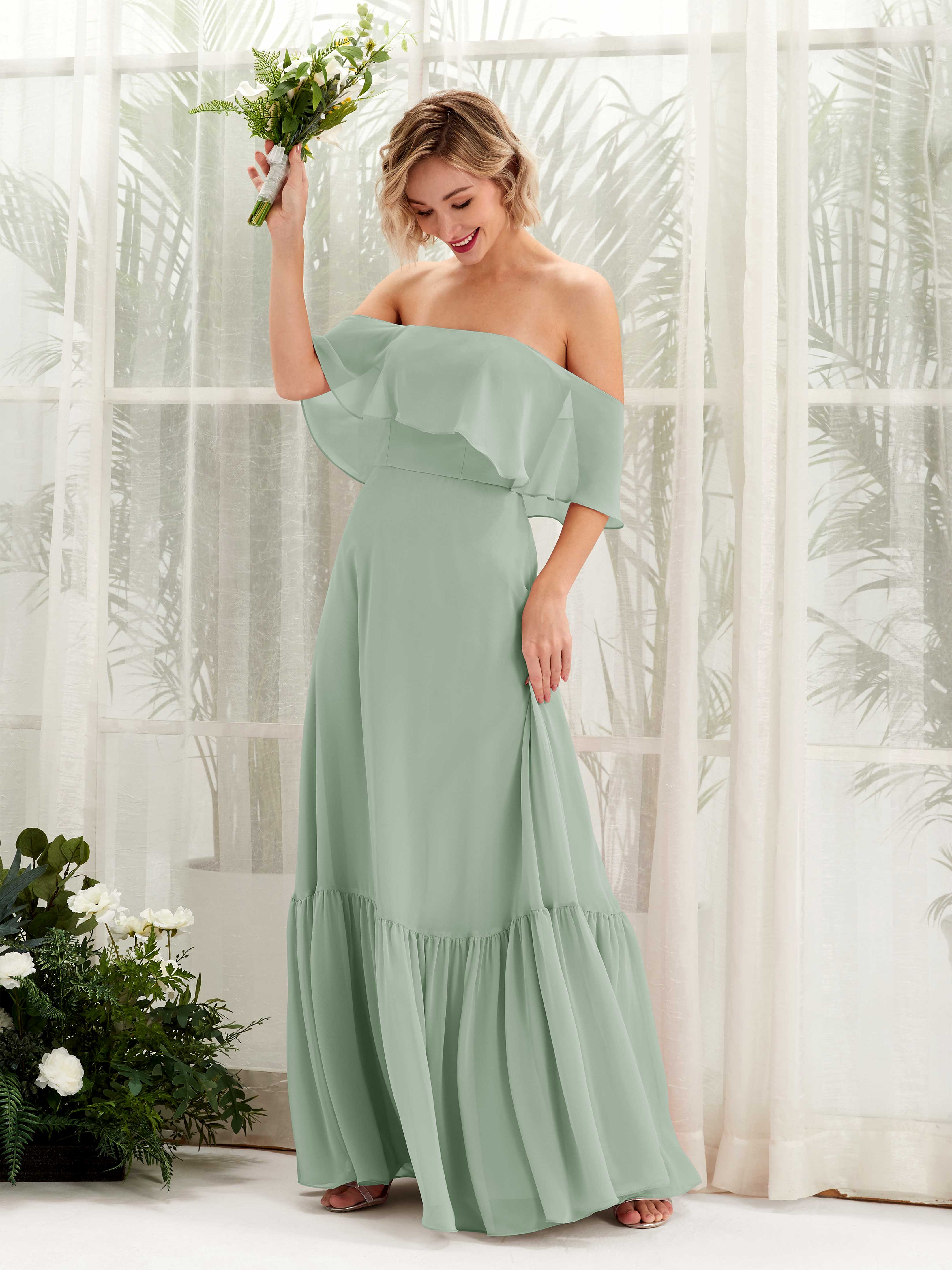 Carlyna Joie A-Line Sage Green Bridesmaid Dress Maxi Sleeveless Off the Shoulder Dress Front View