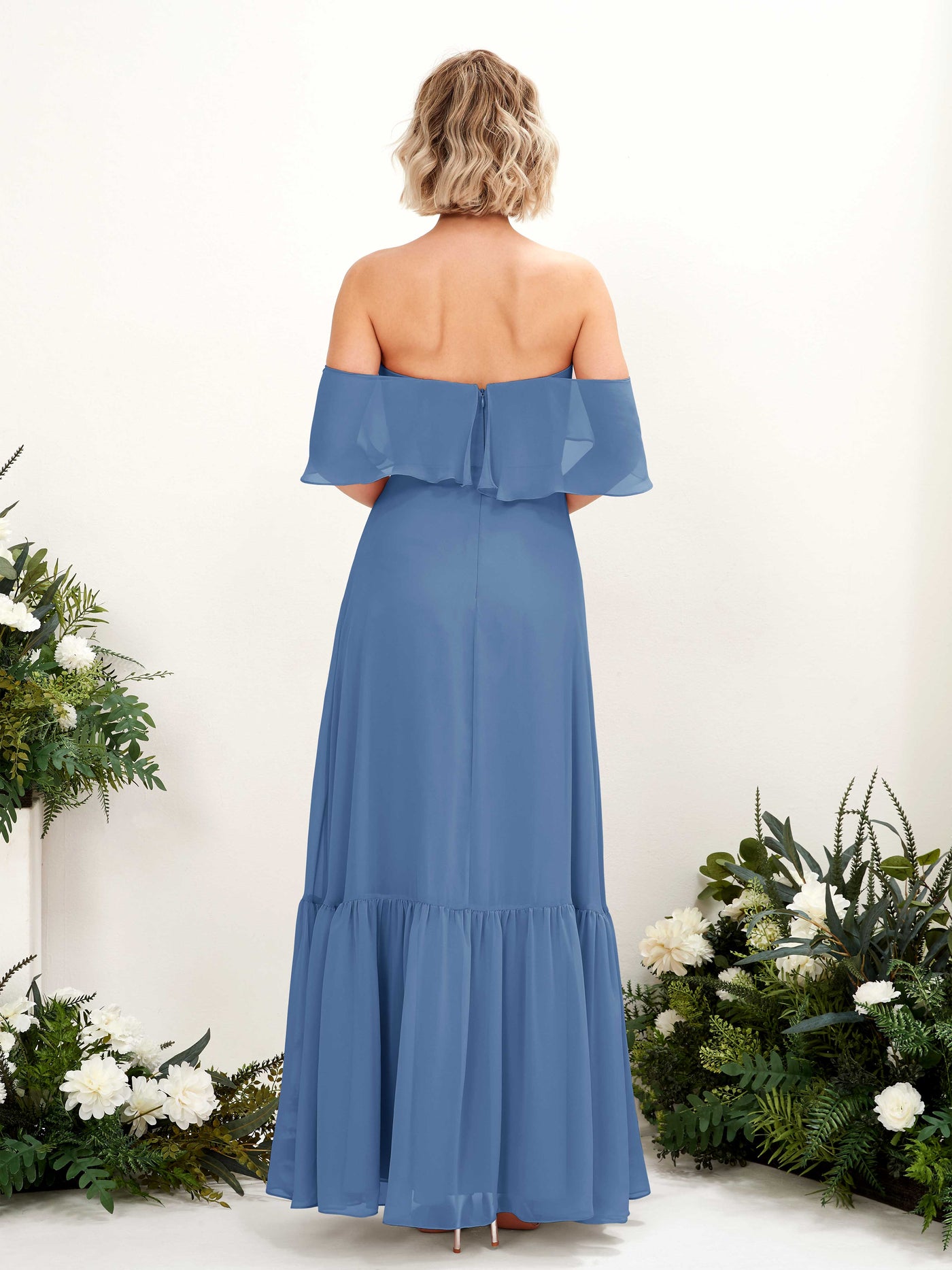 Carlyna Joie A-Line Dusty Blue Bridesmaid Dress Maxi Sleeveless Off the Shoulder Dress Back View