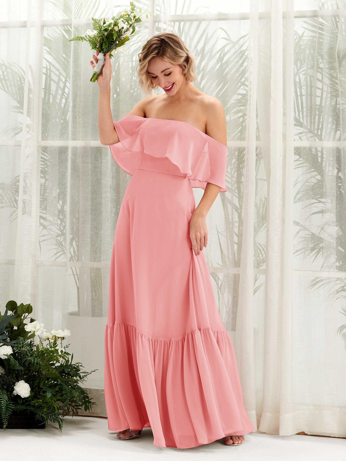 Carlyna Joie A-Line Coral Pink Bridesmaid Dress Maxi Sleeveless Off the Shoulder Dress Front View
