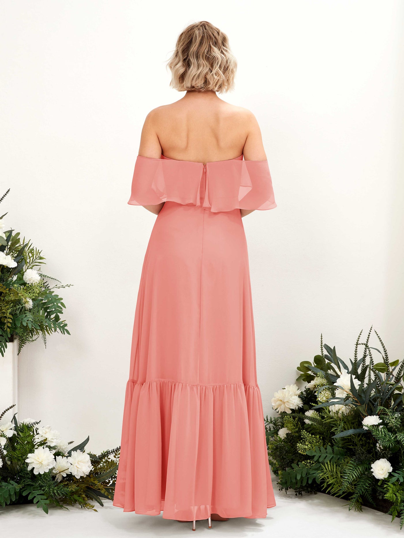 Carlyna Joie A-Line Coral Pink Bridesmaid Dress Maxi Sleeveless Off the Shoulder Dress Back View