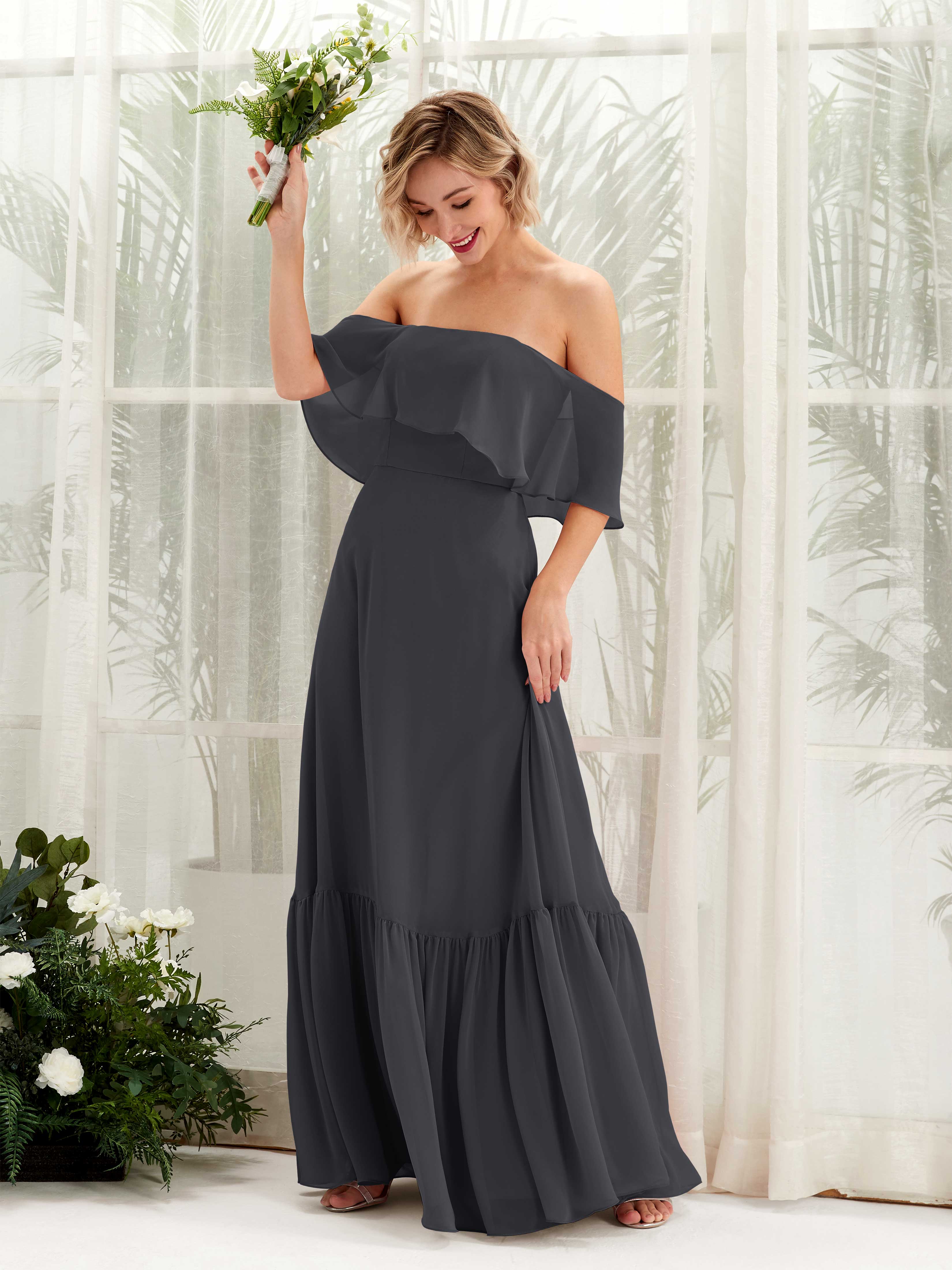 Carlyna Joie A-Line Steel Gray Bridesmaid Dress Maxi Sleeveless Off the Shoulder Dress Front View