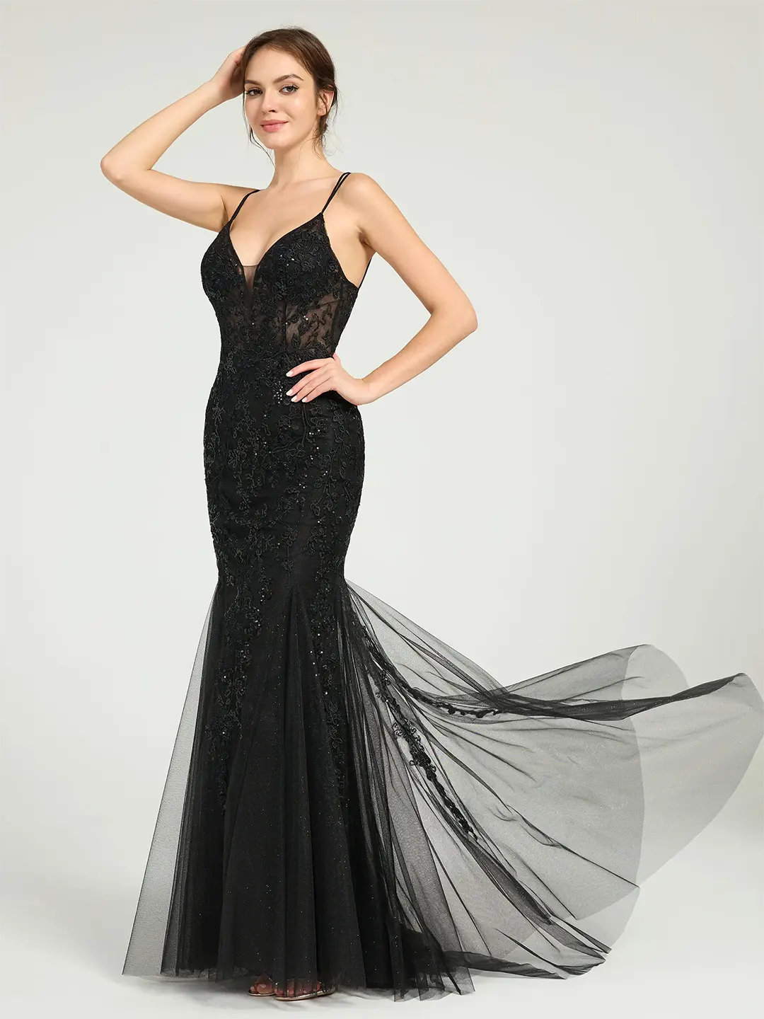 Step into elegance with the Carlyna Black V-Neck Lace-Up Mermaid Maxi Dress. Perfect for formal occasions, this stunning gown features a mermaid silhouette that accentuates your curves and flows beautifully into a floor-length hem. The dress is crafted from luxurious lace and tulle, with delicate sequin embellishments that add a touch of sparkle. The V-neckline and spaghetti straps enhance its feminine allure, while the lace-up back, combined with a lower zipper and hook-eye closure, ensures a secure and tailored fit. Whether you’re attending a wedding, gala, or any other special event, this dress will make you shine.