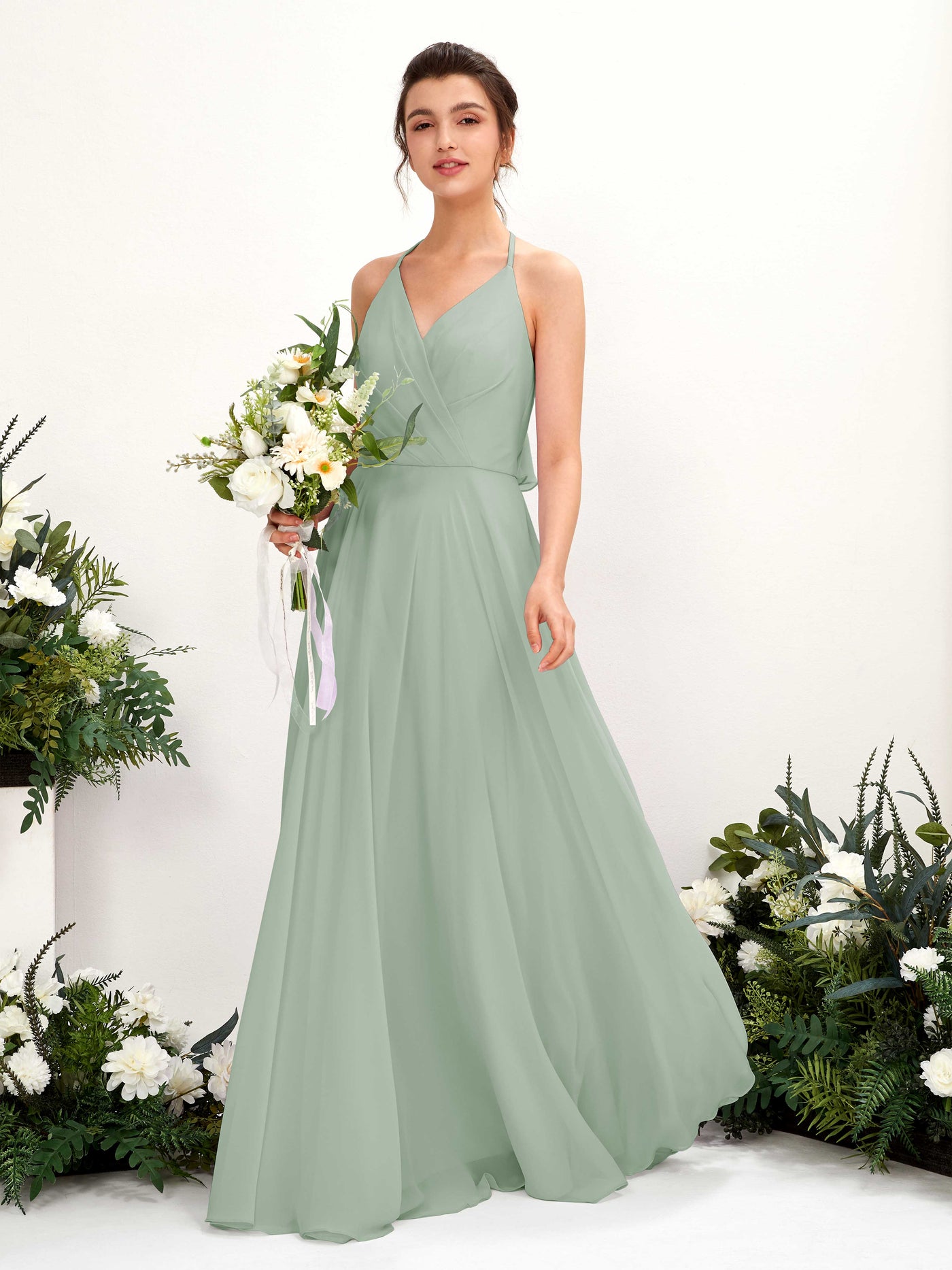 Carlyna Launo A-Line Sage Green Bridesmaid Dress Maxi Sleeveless V-Neck Dress Front View