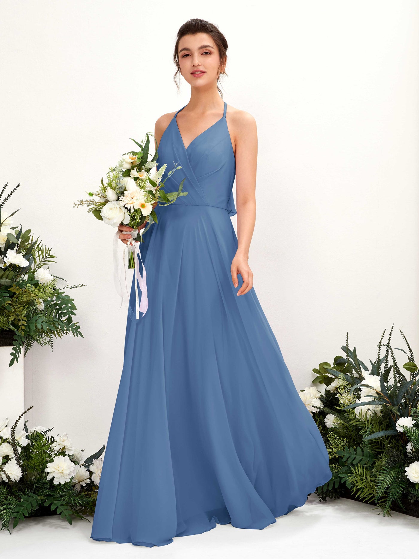Carlyna Launo A-Line Dusty Blue Bridesmaid Dress Maxi Sleeveless V-Neck Dress Front View
