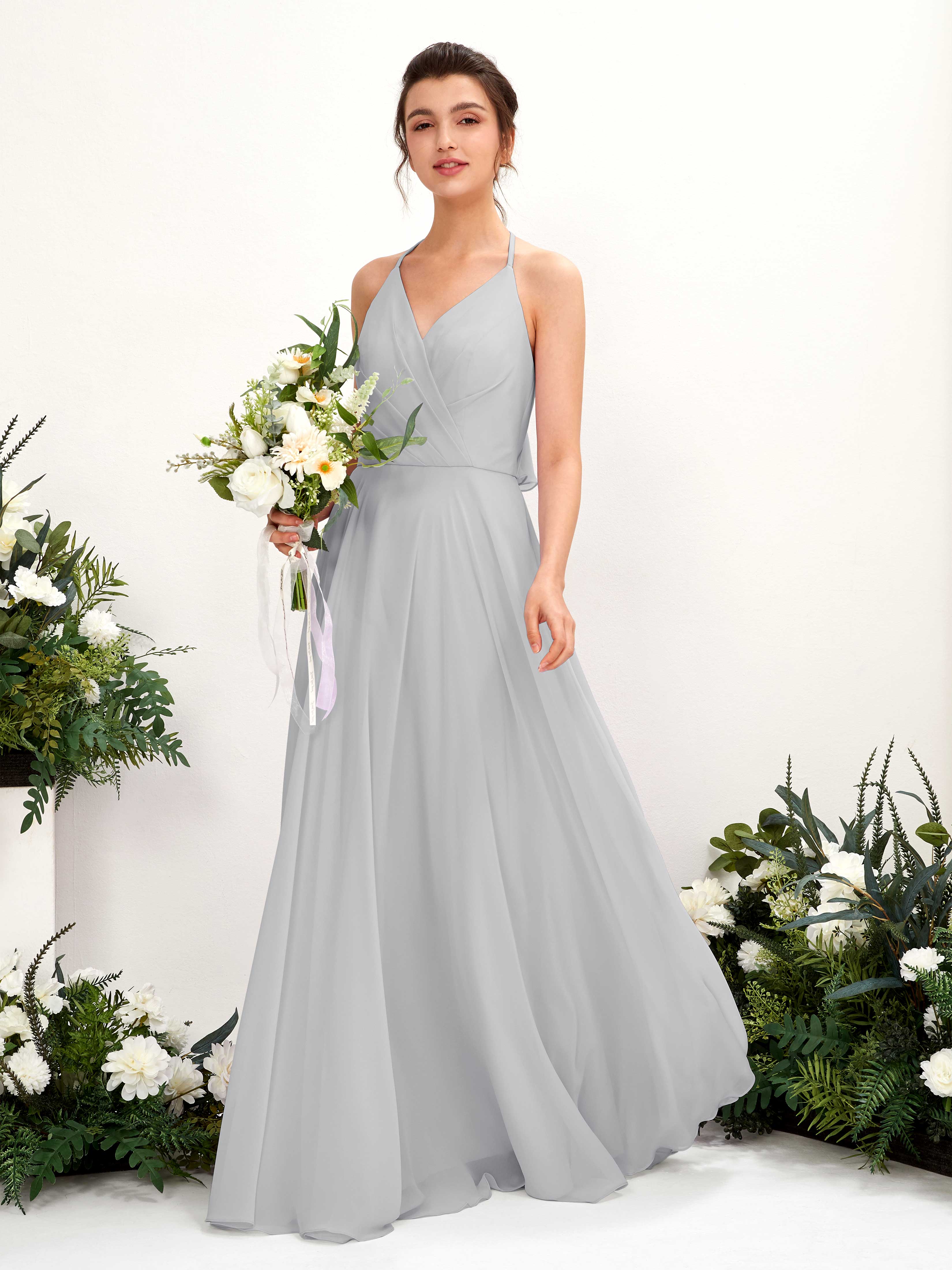 Carlyna Launo A-Line Silver Bridesmaid Dress Maxi Sleeveless V-Neck Dress Front View