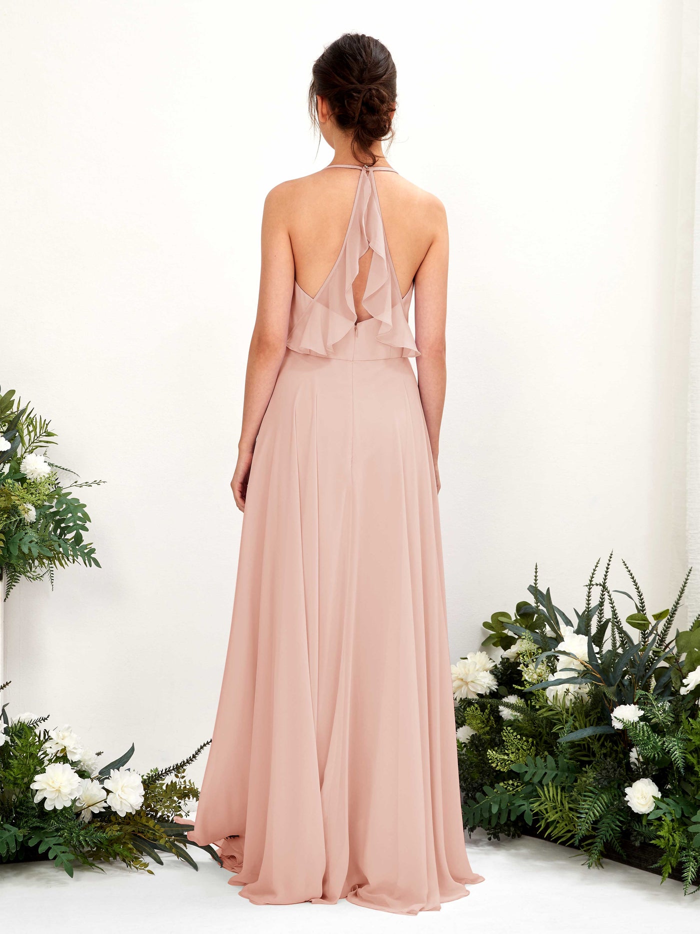 The Carlyna Launo Chiffon Dress is a dream for bridesmaids! This versatile maxi dress offers endless possibilities with a wide range of neckline options, including V-neck, sweetheart, halter, surplice, and spaghetti strap. The A-line silhouette gracefully skims the curves, while the alluring backless and cutout details add a touch of drama. Delicate ruching, playful ruffles, and a subtle leg slit enhance the overall sophistication of this chiffon masterpiece. The Launo Chiffon Dress is designed to make your bridesmaids feel confident and beautiful while perfectly complementing your wedding theme.