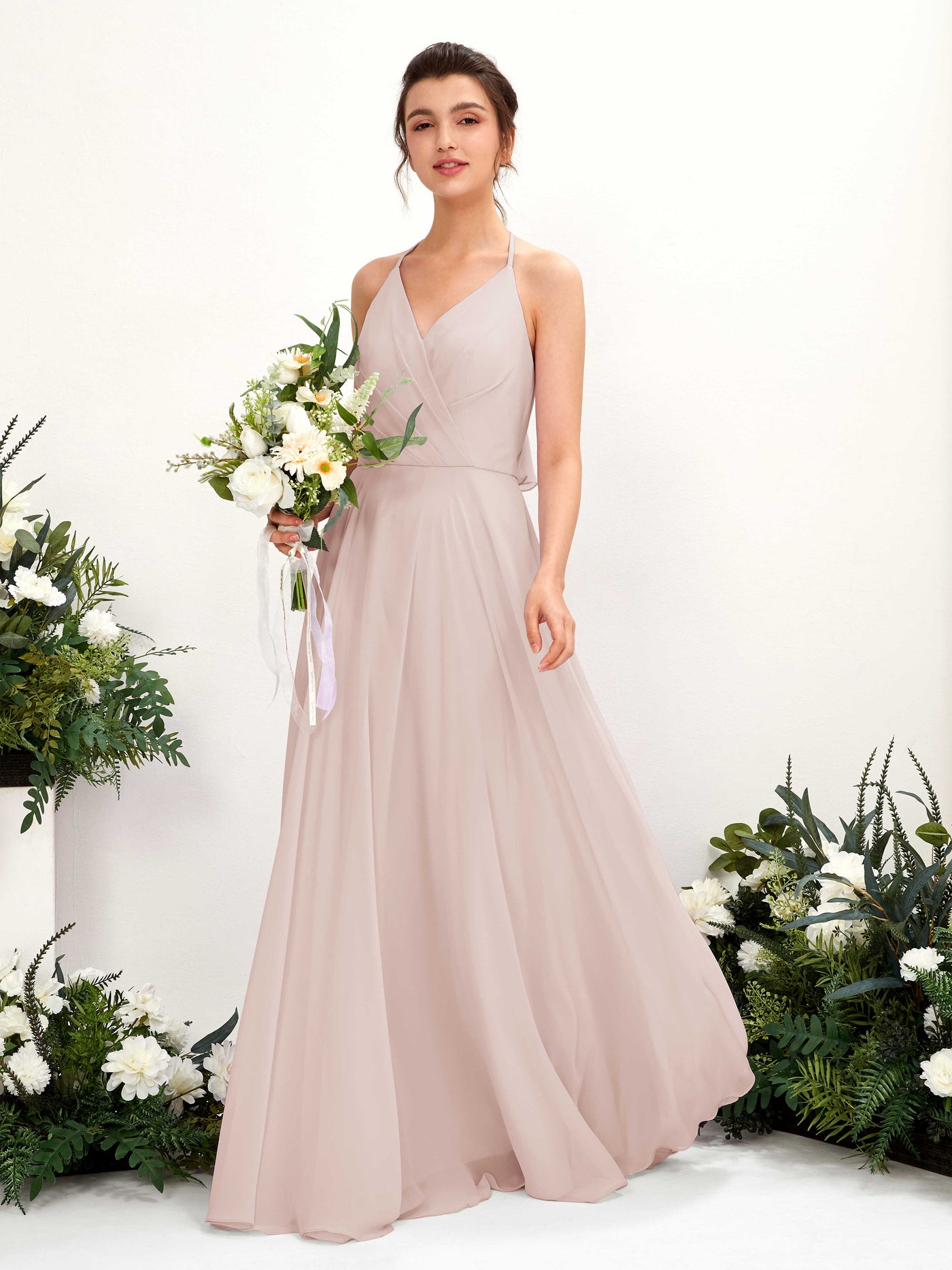Carlyna Launo A-Line Champagne Rose Bridesmaid Dress Maxi Sleeveless V-Neck Dress Front View