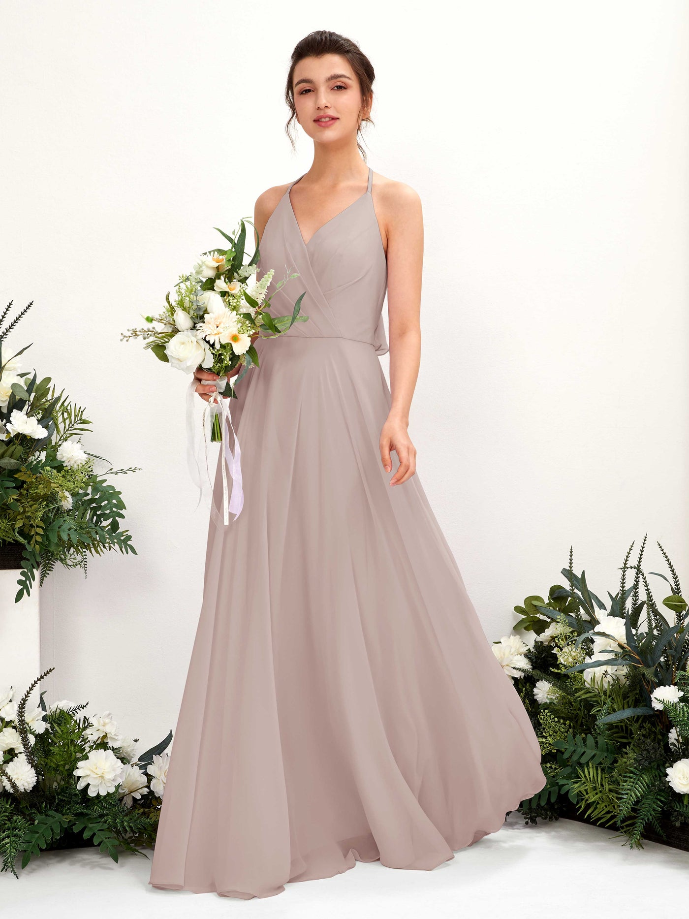 Carlyna Launo A-Line Taupe Bridesmaid Dress Maxi Sleeveless V-Neck Dress Front View