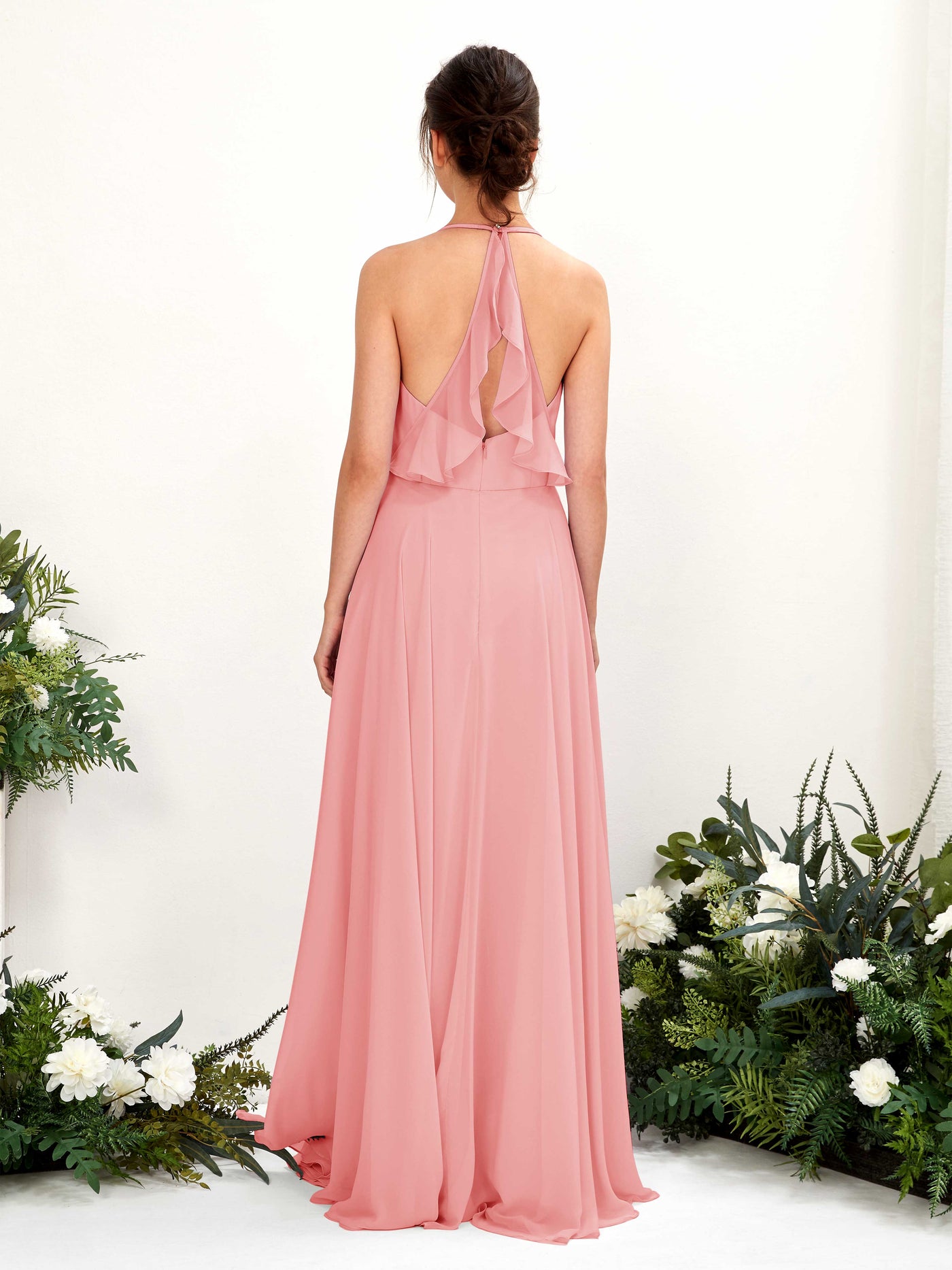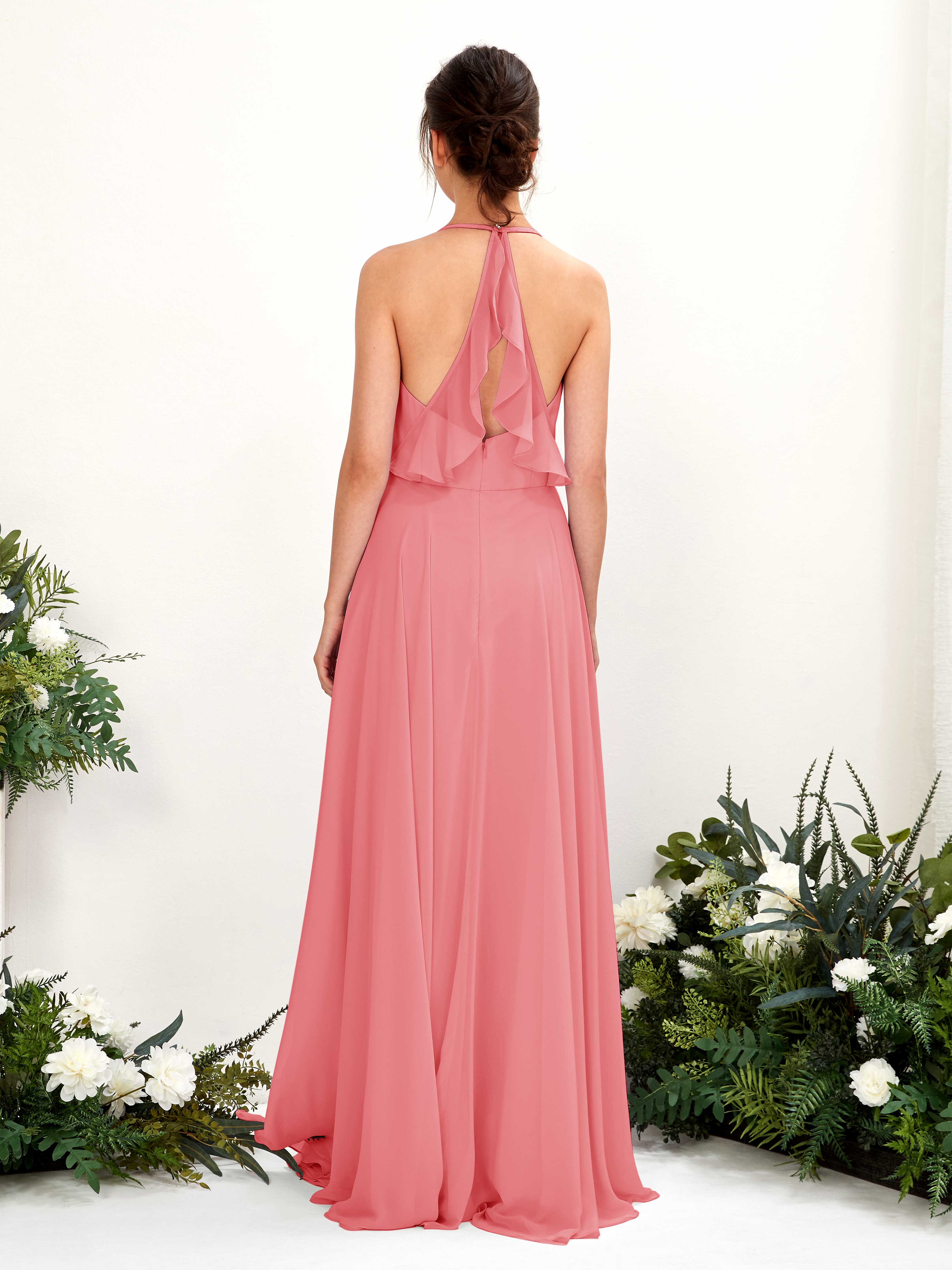 Carlyna Launo A-Line Coral Pink Bridesmaid Dress Maxi Sleeveless V-Neck Dress Back View
