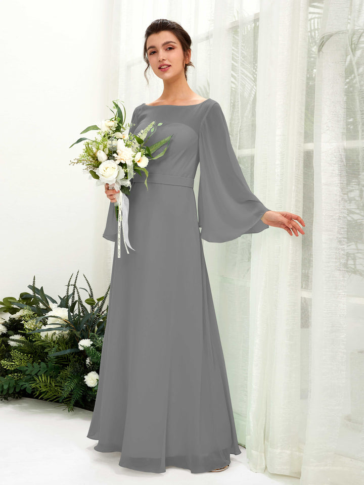 Steel Gray Chiffon A-Line Boat Neck Long Sleeve Maxi Dress