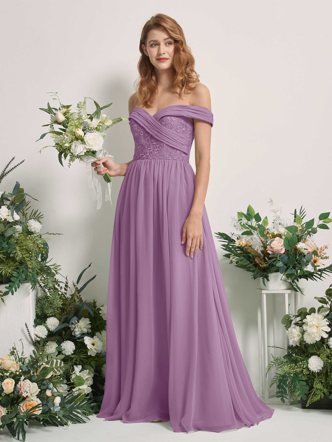Orchid Mist Chiffon A-Line Off the Shoulder Strappy Back Maxi Dress
