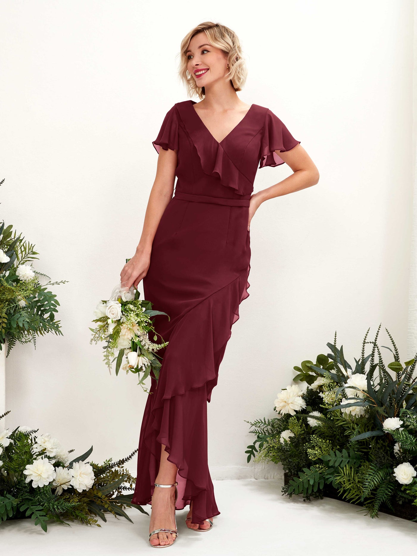 Carlyna Eartha Mermaid Burgundy Bridesmaid Dress Maxi Cap Sleeve V-Neck Dress Front View