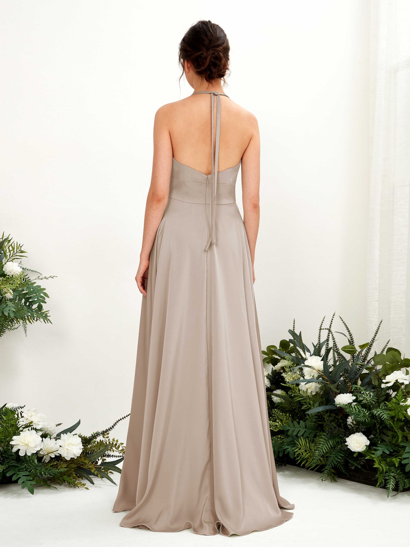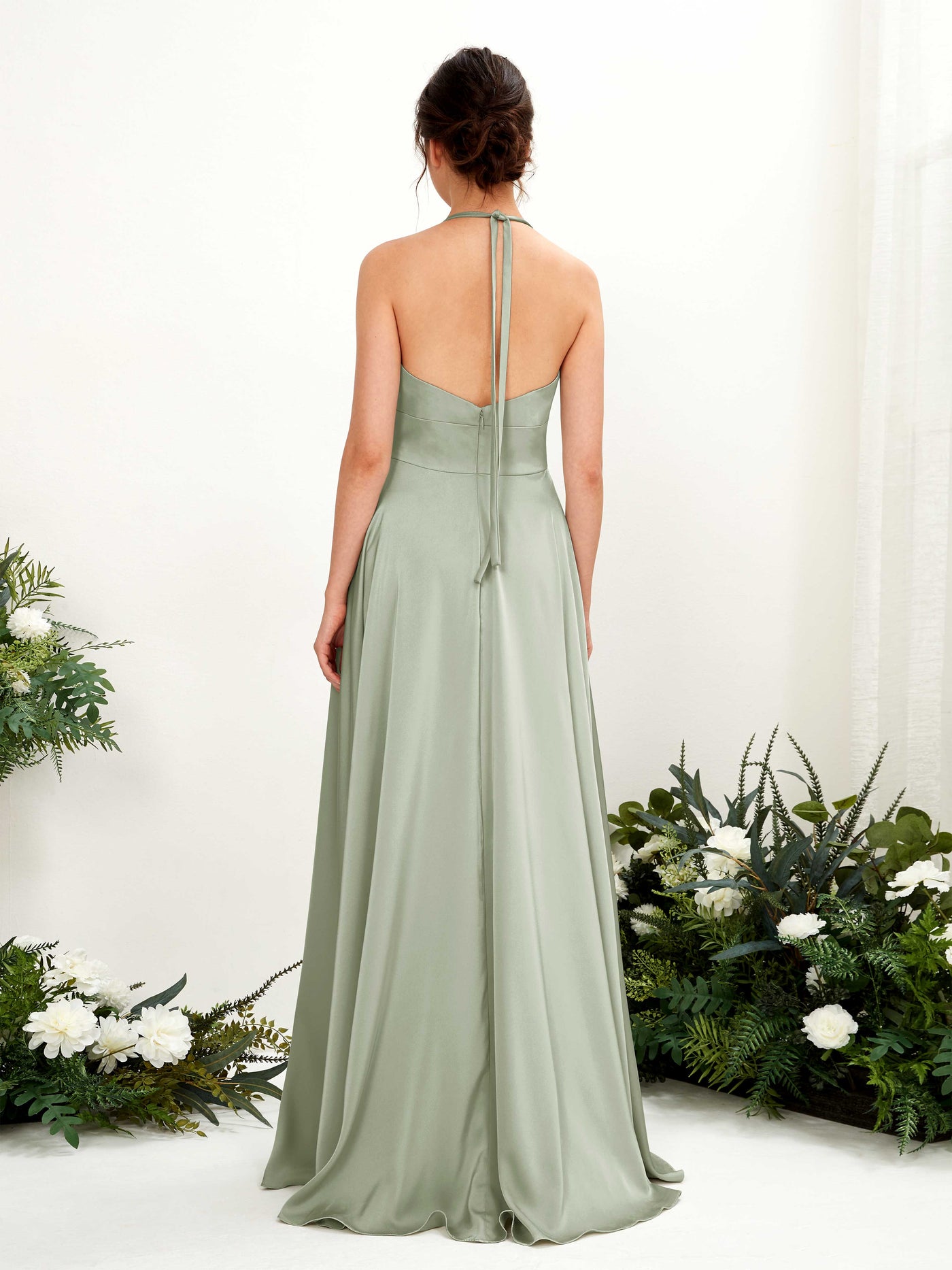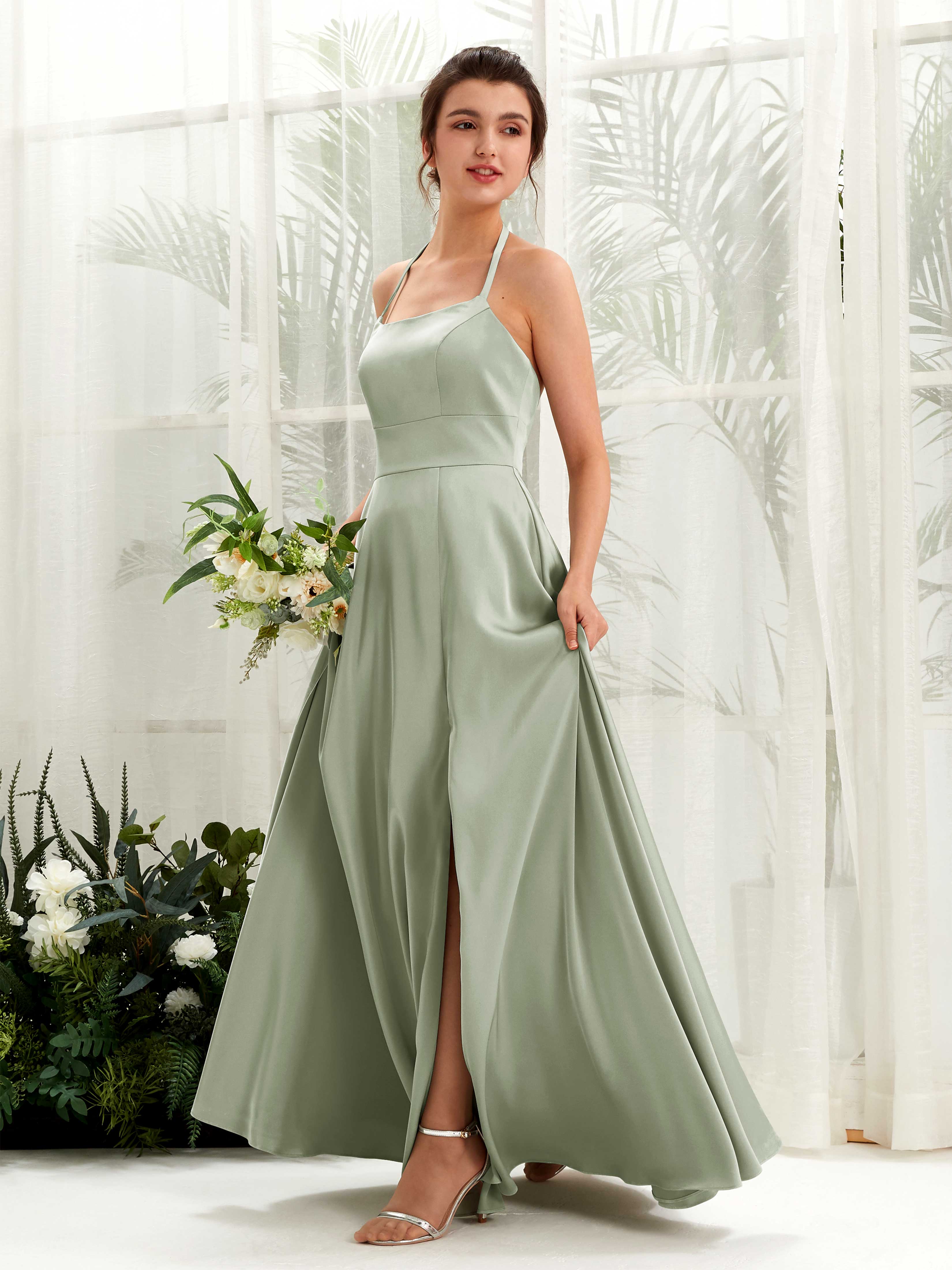 Green Olive Satin A-Line Halter Open Back Maxi Dress