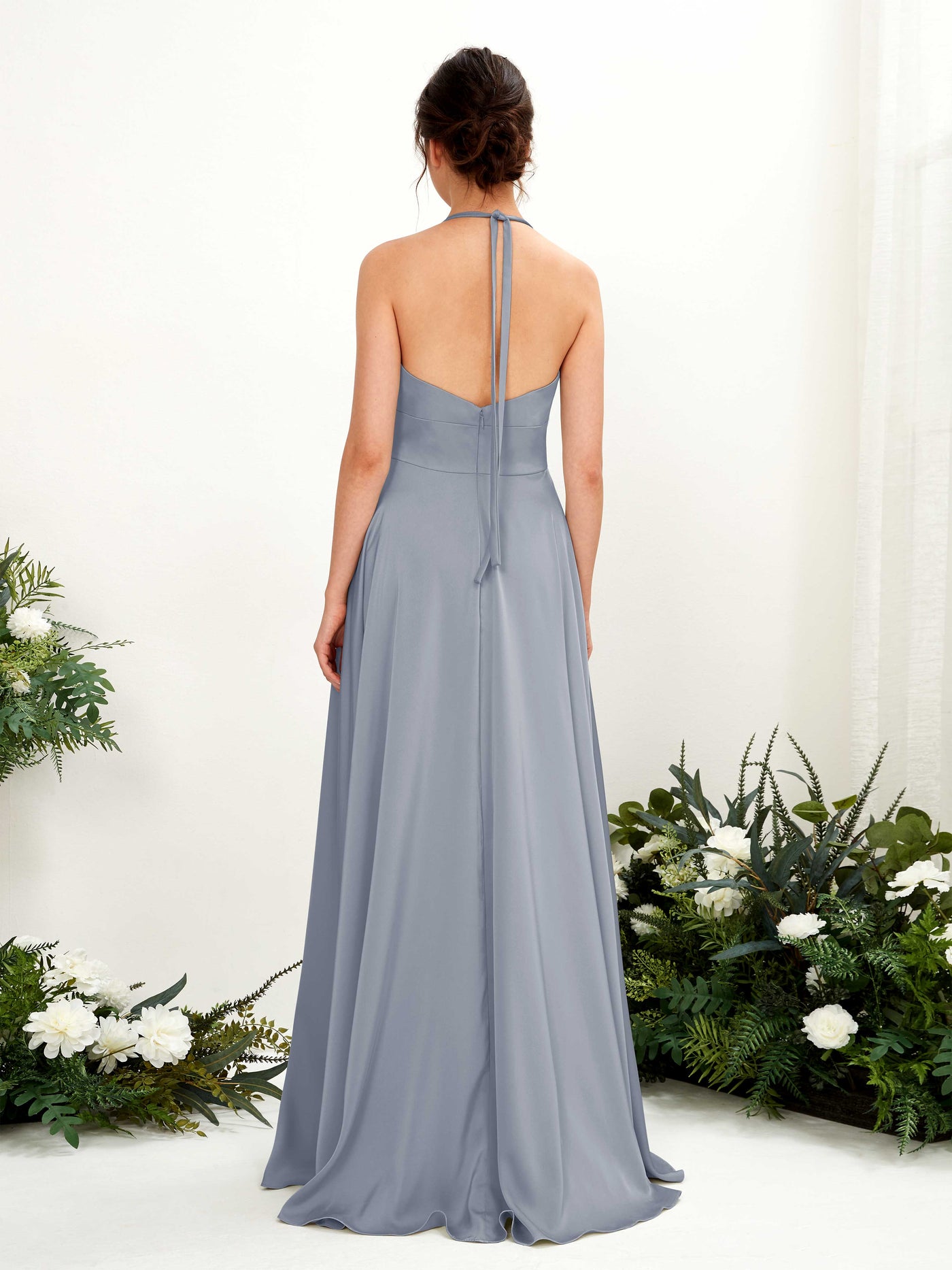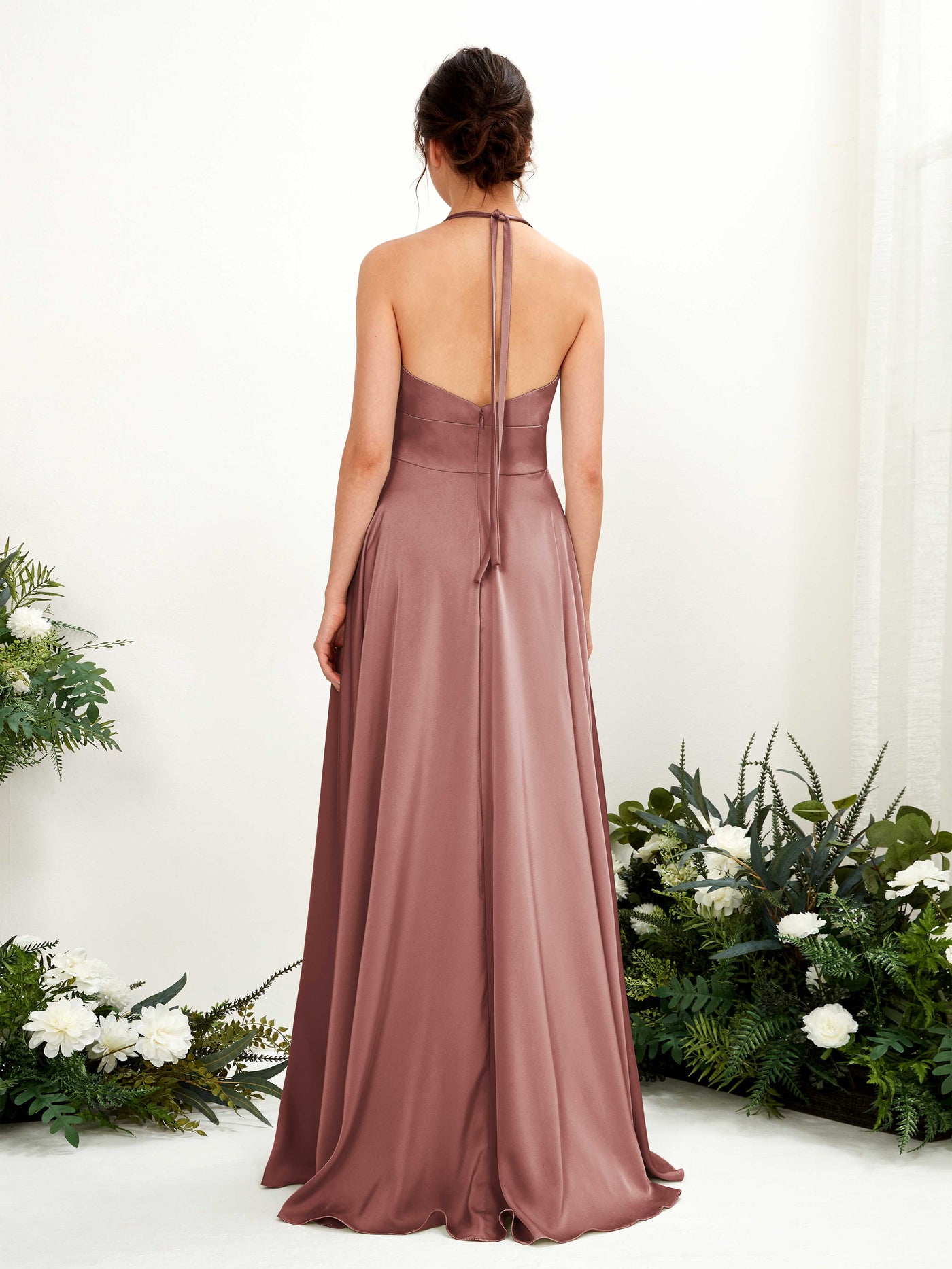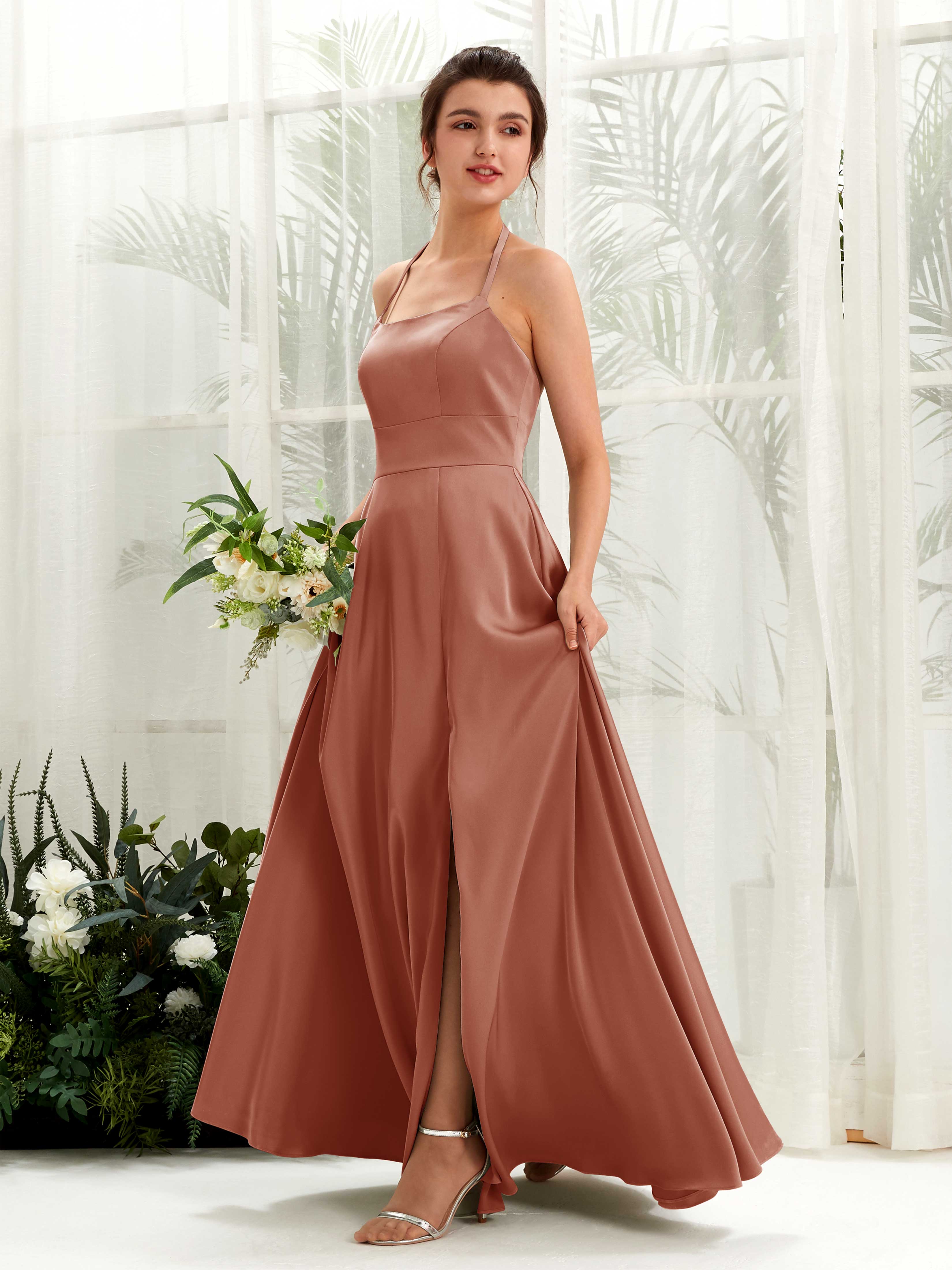 Green Olive Satin A-Line Halter Open Back Maxi Dress
