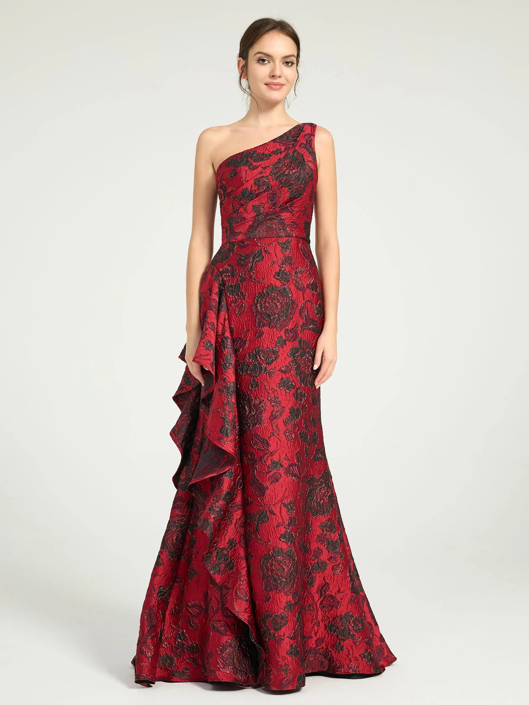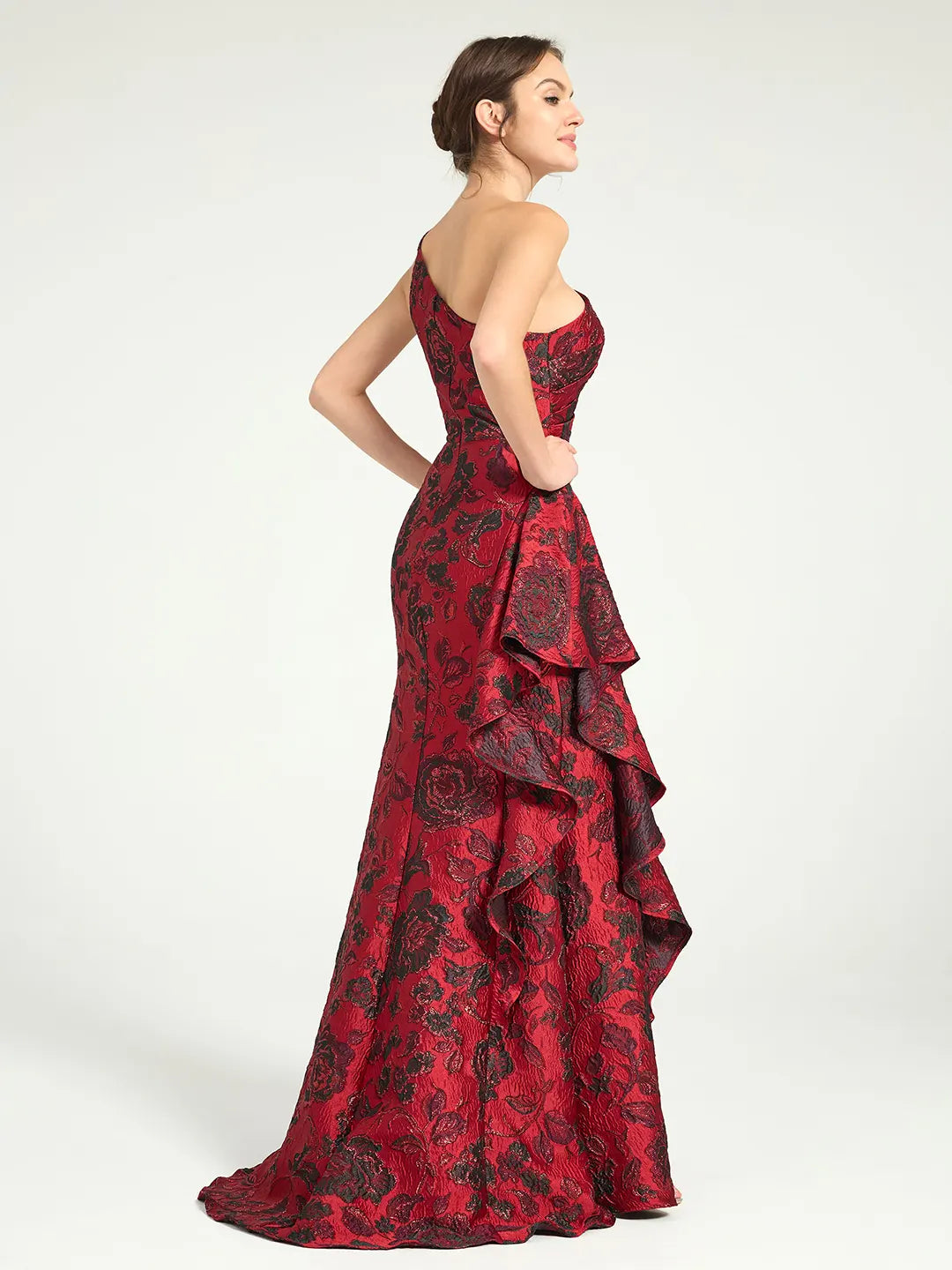 Mermaid Ruffled One-Shoulder Floral Jacquard Formal Dress with Sweep Train