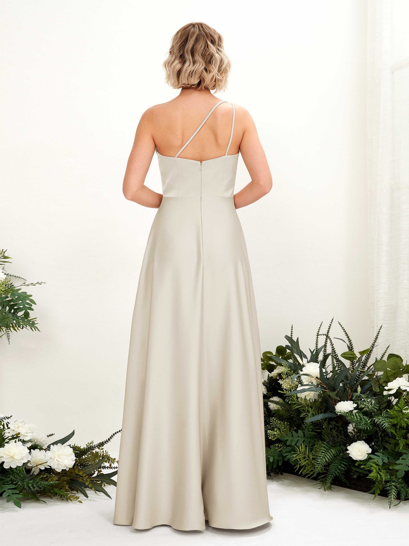Carlyna Dinah A-Line Champagne Satin Bridesmaid Dress Maxi Sleeveless One Shoulder Dress Back View