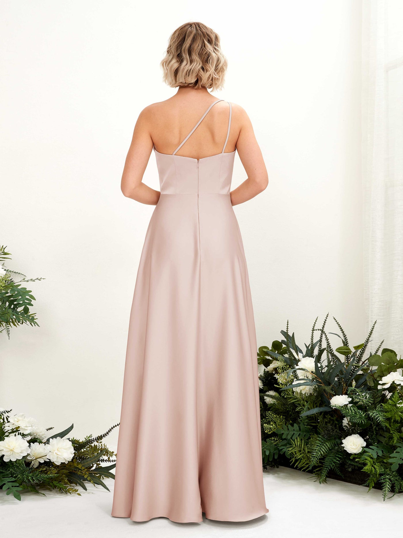 Carlyna Dinah A-Line Pearl Pink Satin Bridesmaid Dress Maxi Sleeveless One Shoulder Dress Back View