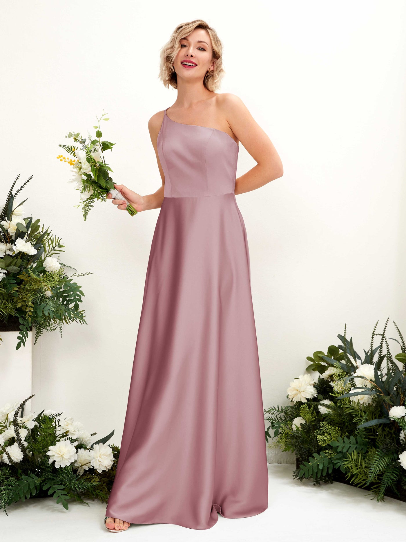 Carlyna Dinah A-Line Dusty Rose Satin Bridesmaid Dress Maxi Sleeveless One Shoulder Dress Front View