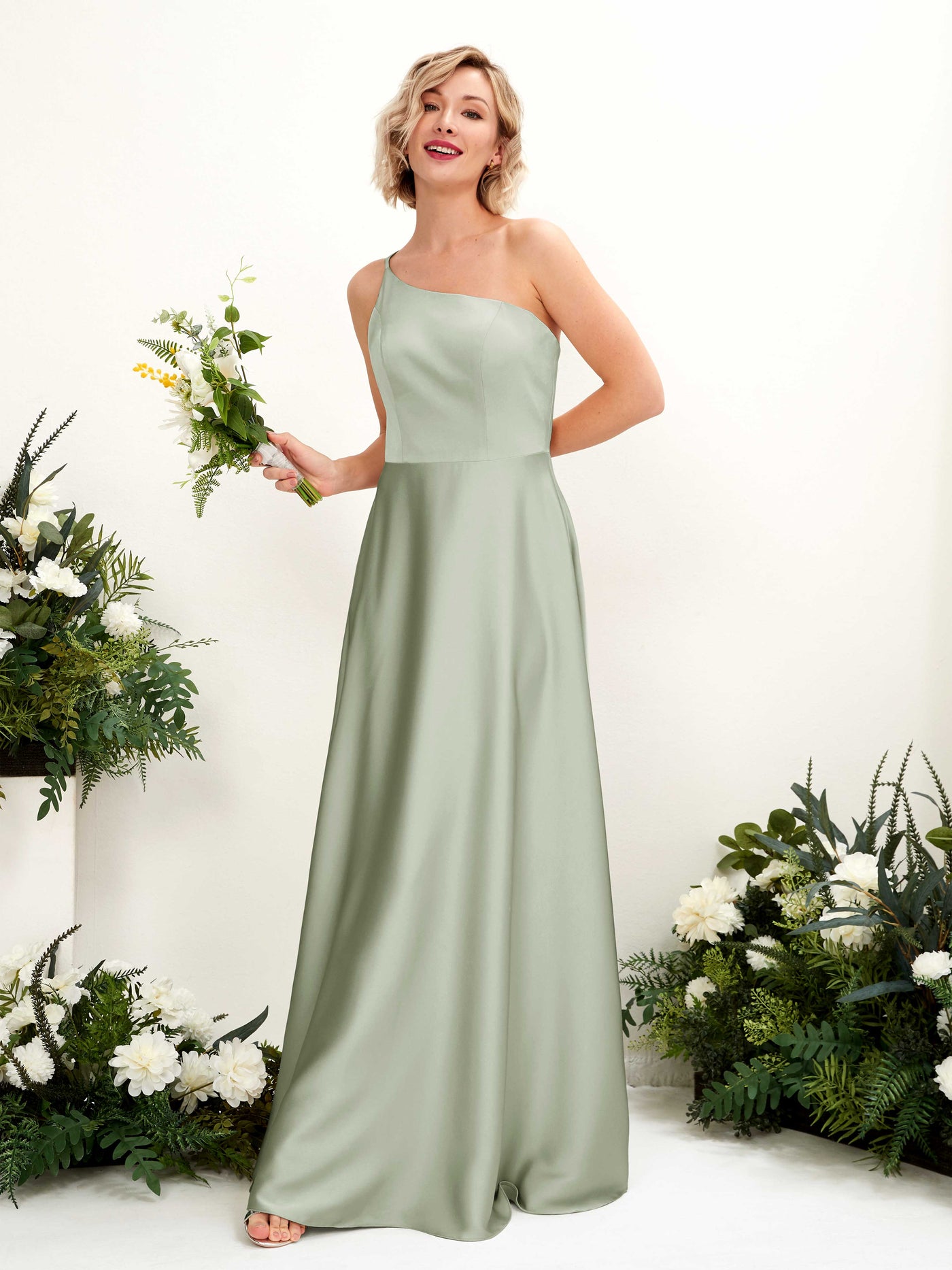 Carlyna Dinah A-Line Sage Green Satin Bridesmaid Dress Maxi Sleeveless One Shoulder Dress Front View