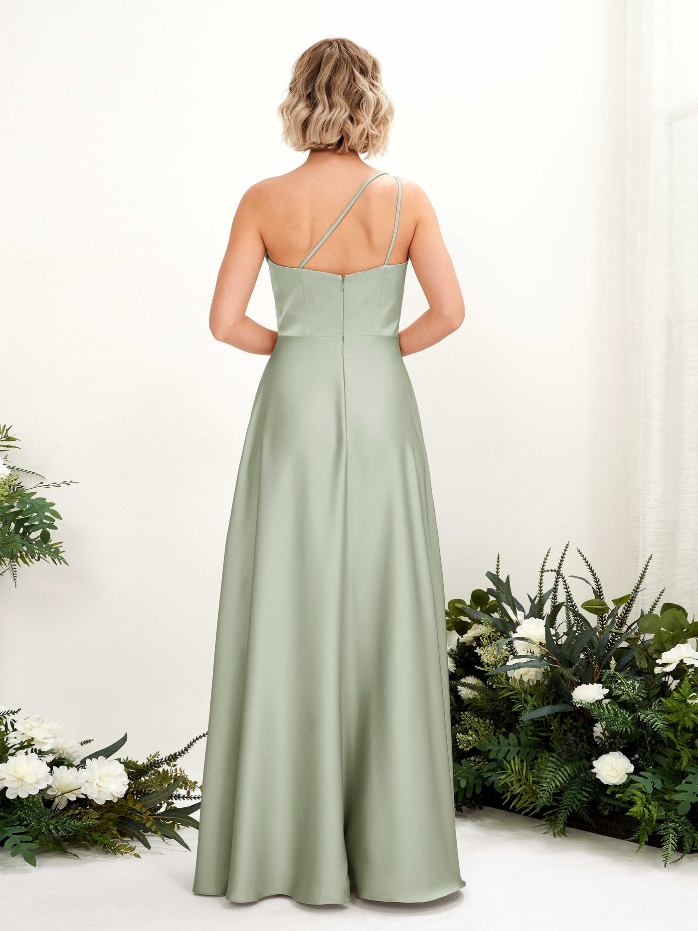 Carlyna Dinah A-Line Sage Green Satin Bridesmaid Dress Maxi Sleeveless One Shoulder Dress Back View