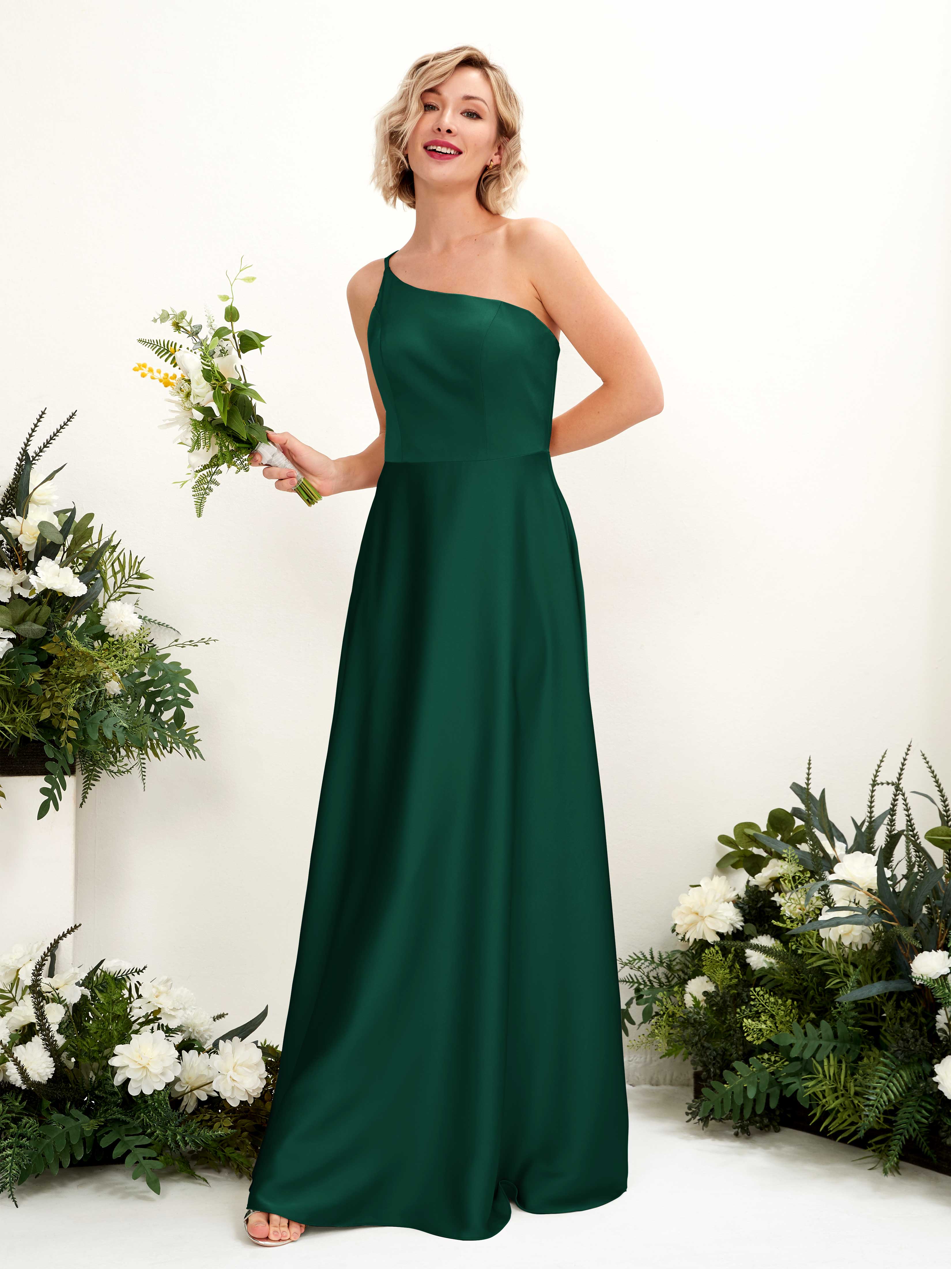 Carlyna Dinah A-Line Hunter Green Satin Bridesmaid Dress Maxi Sleeveless One Shoulder Dress Front View