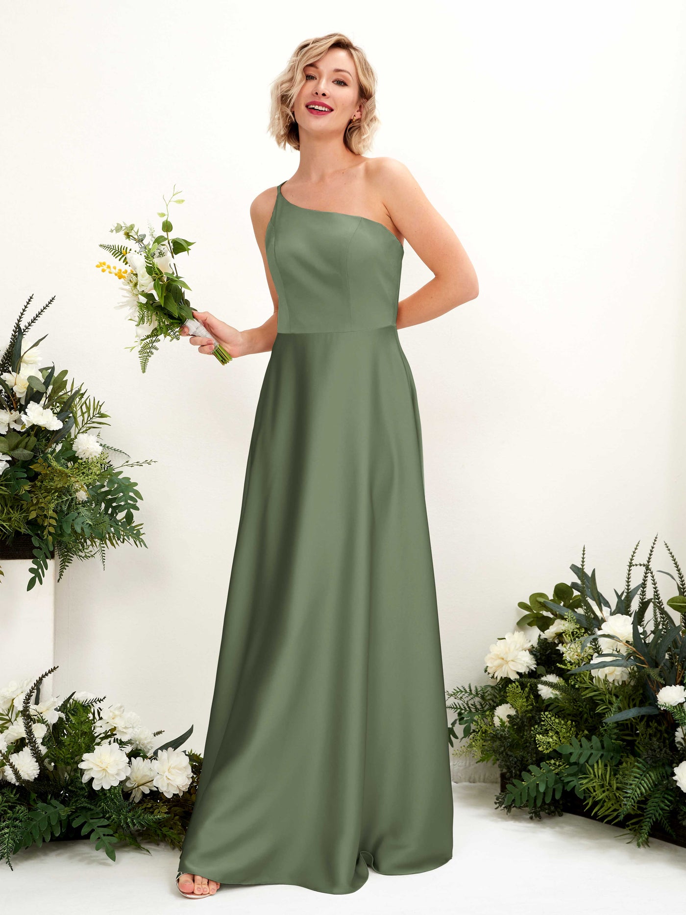 Carlyna Dinah A-Line Green Olive Satin Bridesmaid Dress Maxi Sleeveless One Shoulder Dress Front View