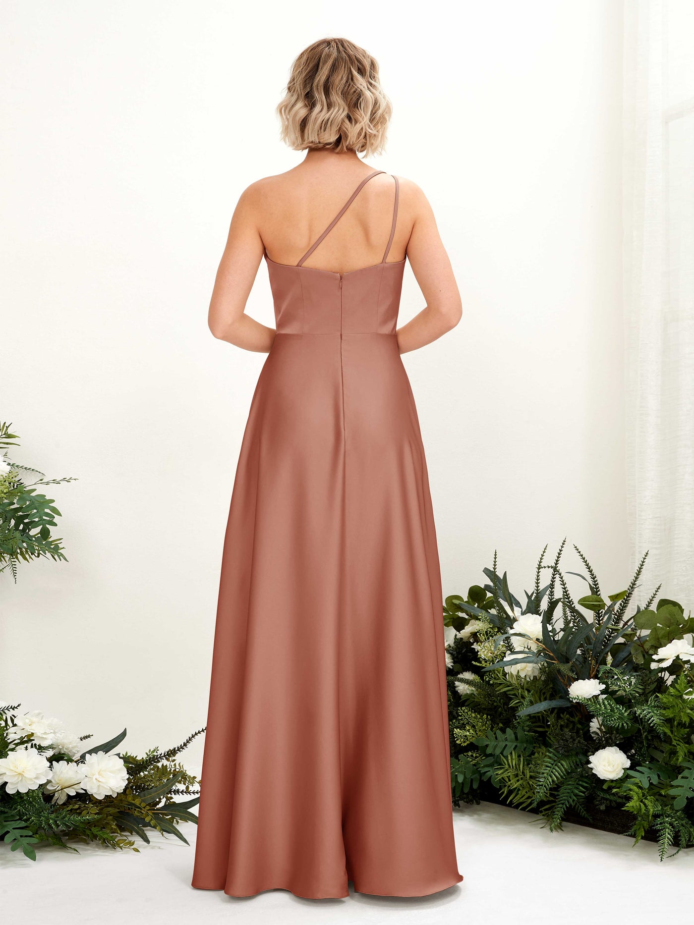 Carlyna Dinah A-Line Desert Rose Satin Bridesmaid Dress Maxi Sleeveless One Shoulder Dress Back View