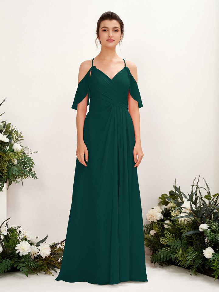 Dark Emerald Chiffon A-Line Off the Shoulder Strappy Back Maxi Dress