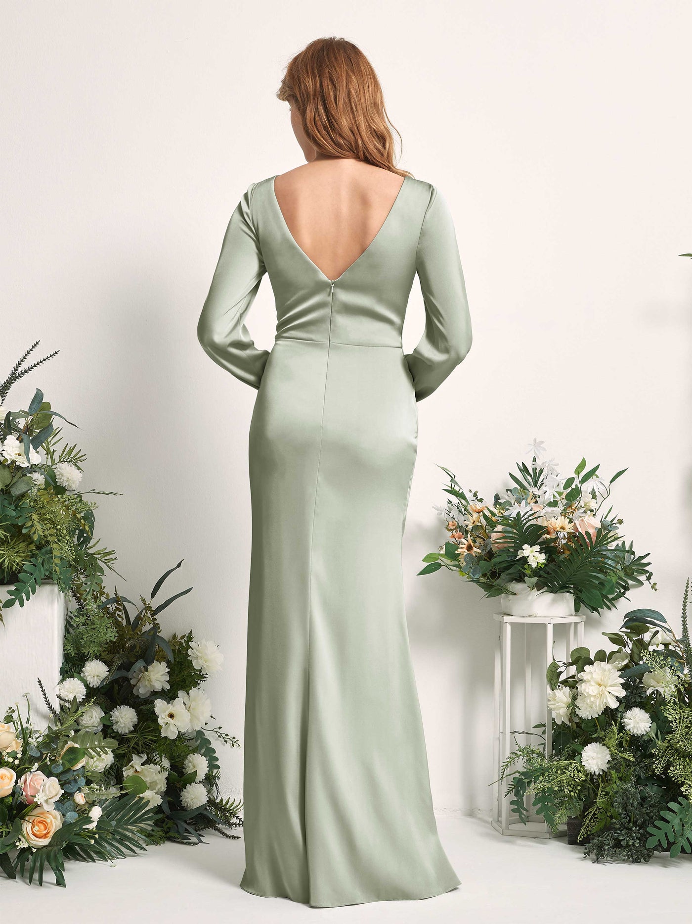 Carlyna Taylor Mermaid Sage Green Satin Bridesmaid Dress Maxi Long Sleeve V-Neck Back View