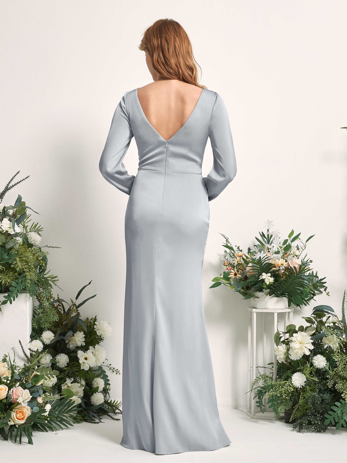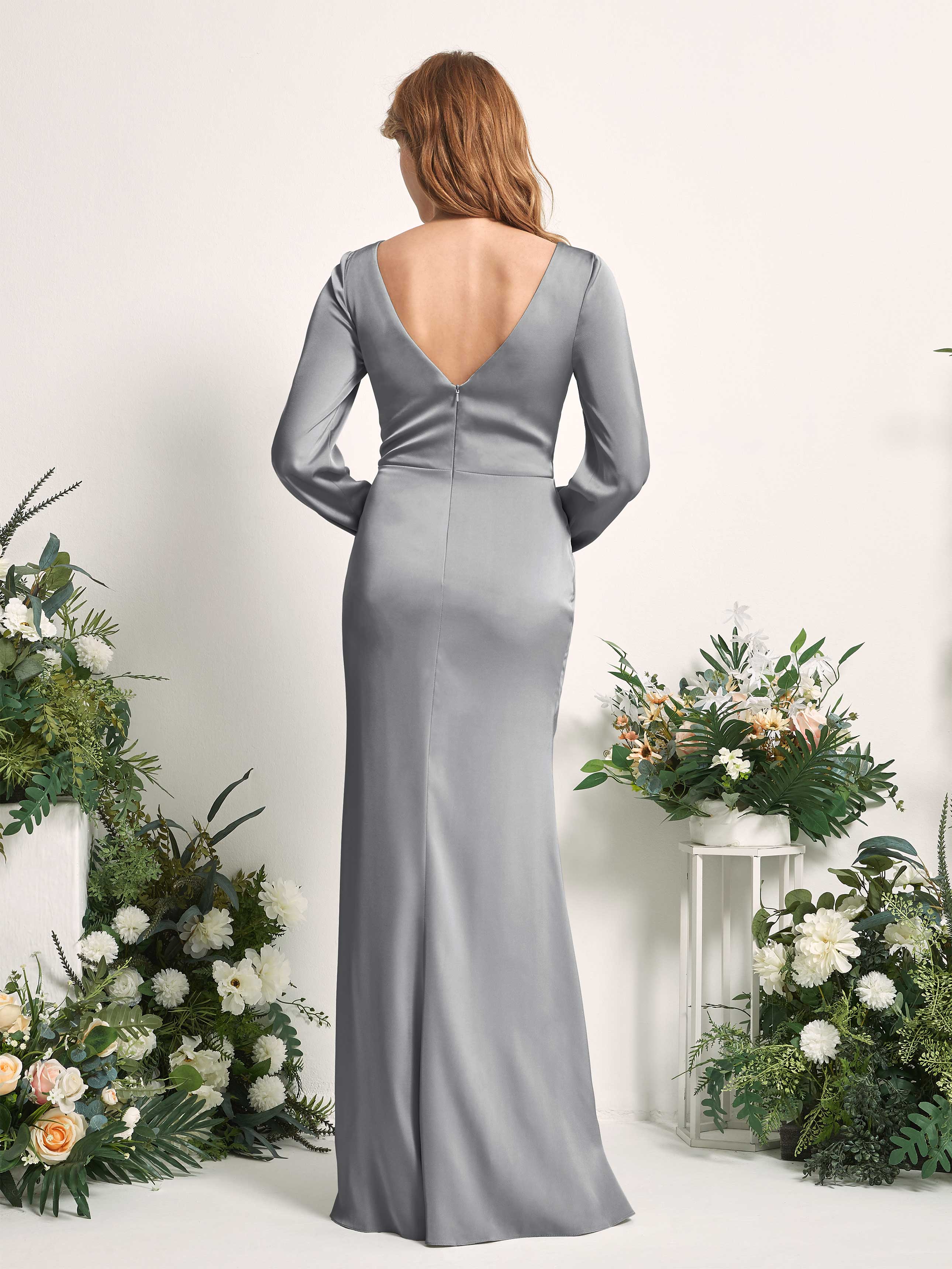 Carlyna Taylor Mermaid Steel Gray Satin Bridesmaid Dress Maxi Long Sleeve V-Neck Side View 2