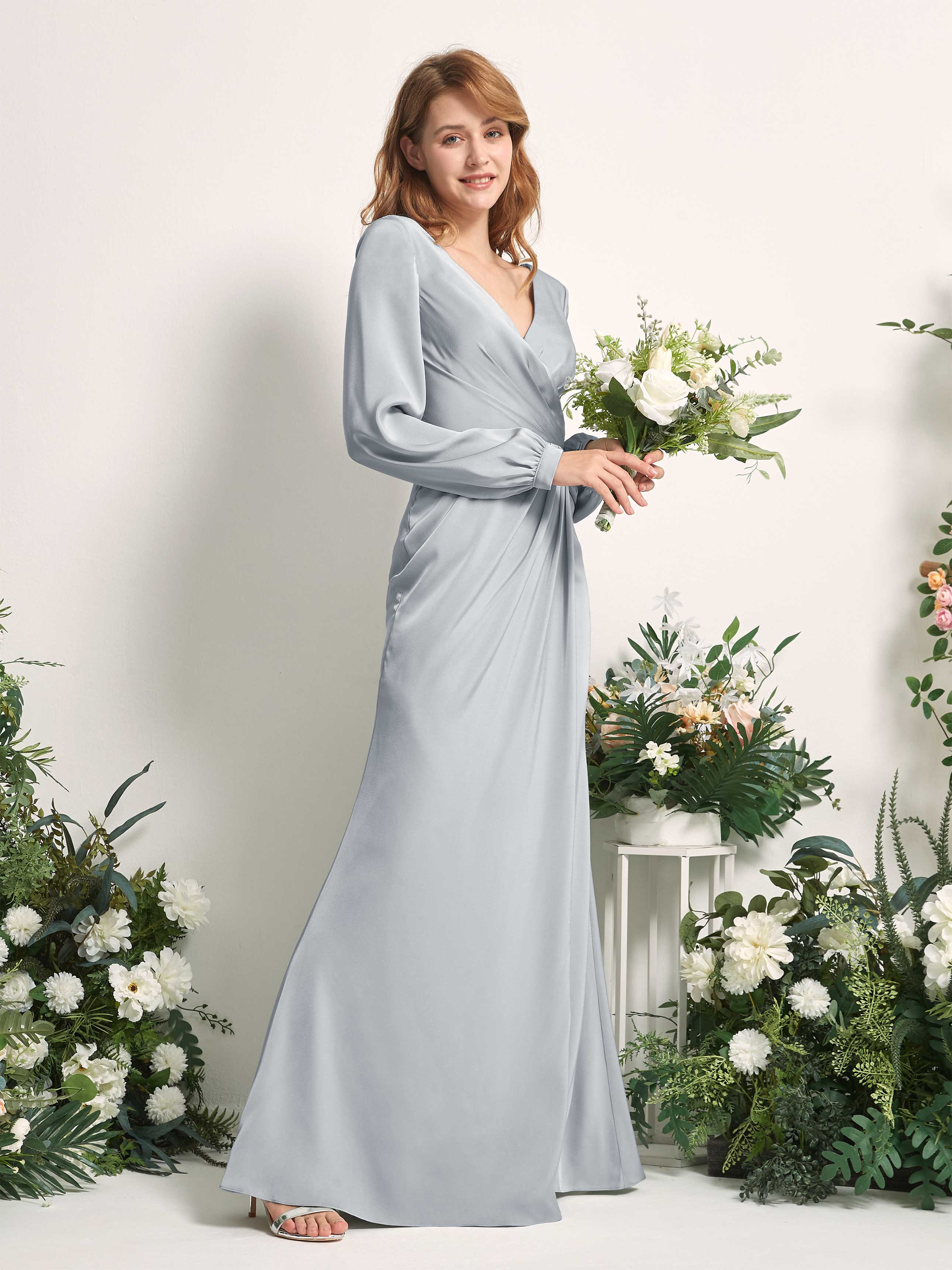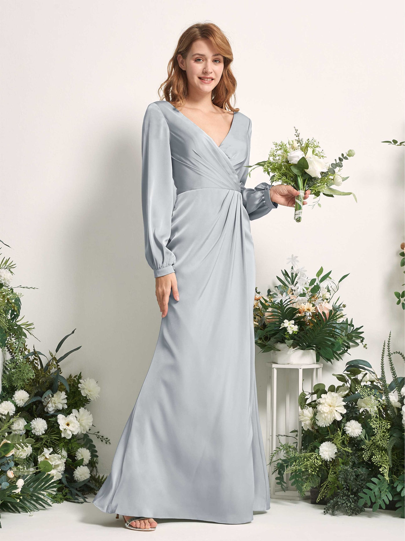 Carlyna Taylor Mermaid Steel Gray Satin Bridesmaid Dress Maxi Long Sleeve V-Neck Front View